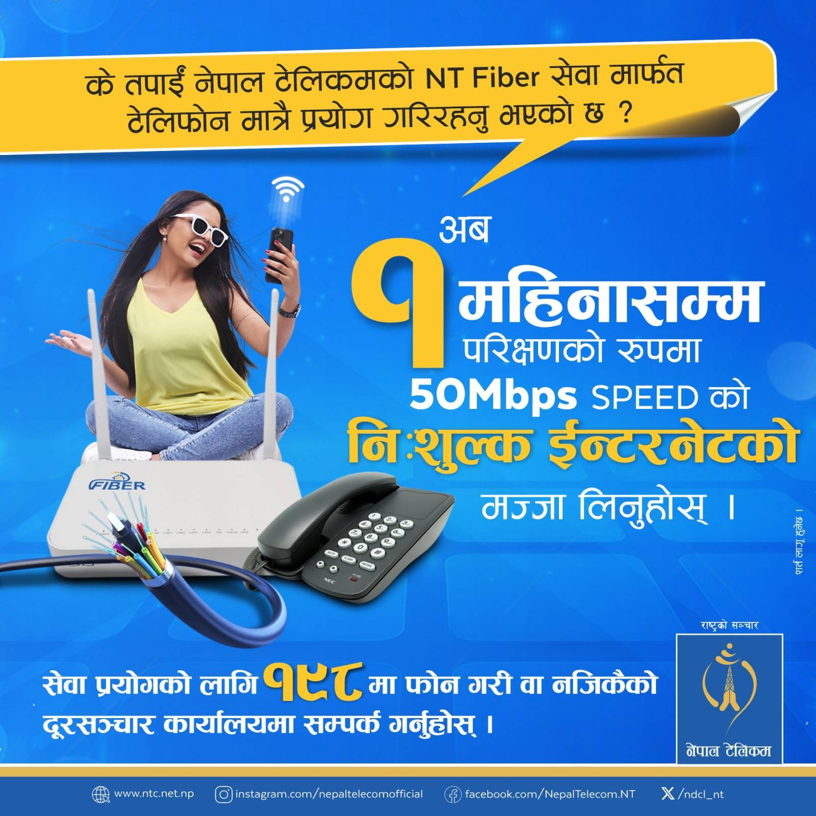 नेपाल टेलिकमले मंसिर २५ गतेदेखि लागु हुने गरी एनटी फाइबर प्रविधि अन्तर्गत टेलिफोन सेवा मात्र प्रयोग गर्दै आएका सेवाग्राहीलाई प्रोमोसनल अफरका रुपमा एक महिनासम्म निःशुल्क ५० एमबीपीएस स्पिडको डाटा सेवा उपलब्ध गराउने भएको हो । टेलिकमका अनुसार यो सेवा प्रयोग गर्नका लागि१९८–१ (१९८ मा डायल गरी प्राप्त सन्देश पश्चात फेरि १ डायल गरी) मा अनुरोध गर्न सकिन्छ । त्यसैगरी नजिकको दूरसञ्चार कार्यालय मार्फत पनि यो सुविधा लिन सकिने छ ।