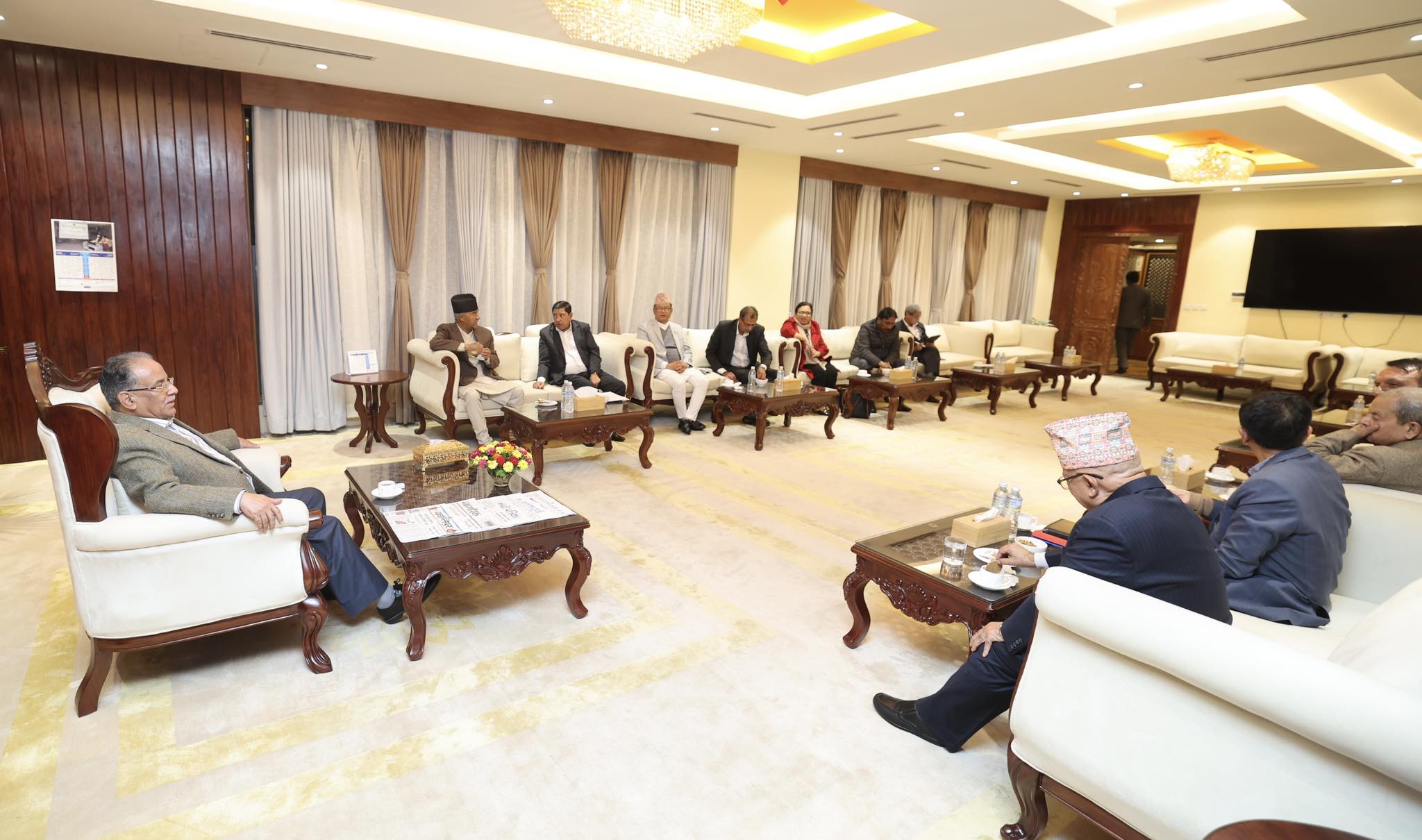 बैठकमा प्रधानमन्त्री प्रचण्ड, माओवादीका महासचिव देव गुरुङ, कांग्रेसका सभापति शेरबहादुर देउवा, एकीकृत समाजवादीका अध्यक्ष माधवकुमार नेपाललगायत शीर्ष नेताहरू सहभागी छन् ।