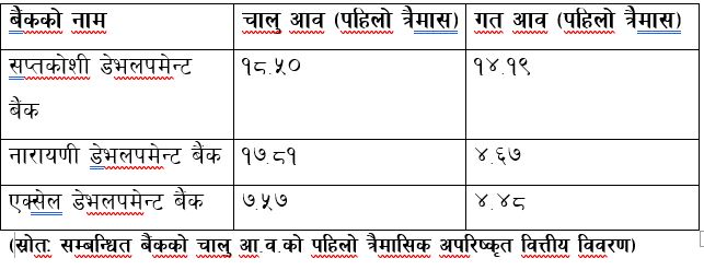 बैंकहरुले स्वयम्ले सार्वजनिक गरेको चालु आर्थिक बर्षको पहिलो त्रैमासिक अर्थात् असोज मसान्तसम्मको वित्तीय विवरणलाई आधार मान्ने हो भने पनि क्षेत्रियस्तरका तीन वटा विकास बैंकहरुमा खराब कर्जा निकै नै उच्च देखिएको छ । गत आर्थिक बर्षको पहिलो त्रैमासको तुलनामा चालु आ.व.को पहिलो त्रैमासमा यी तीन वटा बैंकहरुमा खराब कर्जा निकै नैं बढेको छ ।