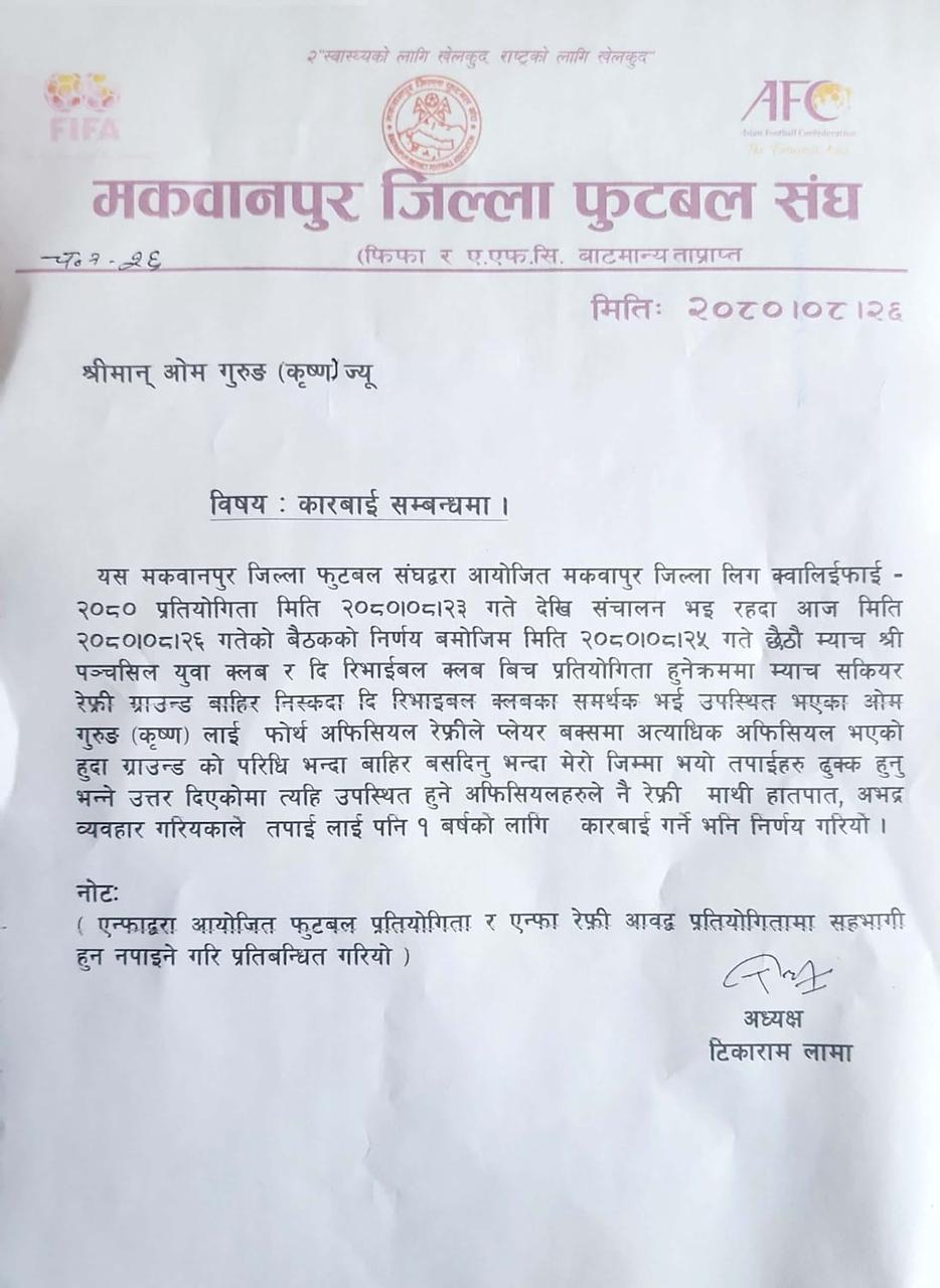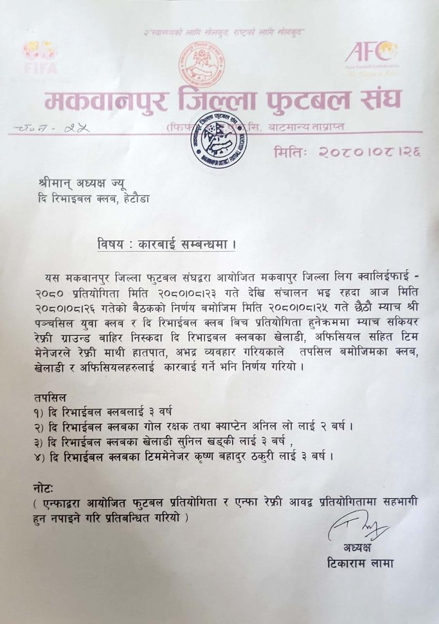 मंगलबार सो विषयमा मकवानपुर जिल्ला फुटबल संघले कुटपिटमा संलग्न २ जना खेलाडिसहित क्लबलाई एन्फाद्वारा खेलाइने र एन्फा रेफ्री संलग्न कुनैपनि प्रतियोगिता खेल्न नपाउने गरी प्रतिबन्ध गरेको छ ।