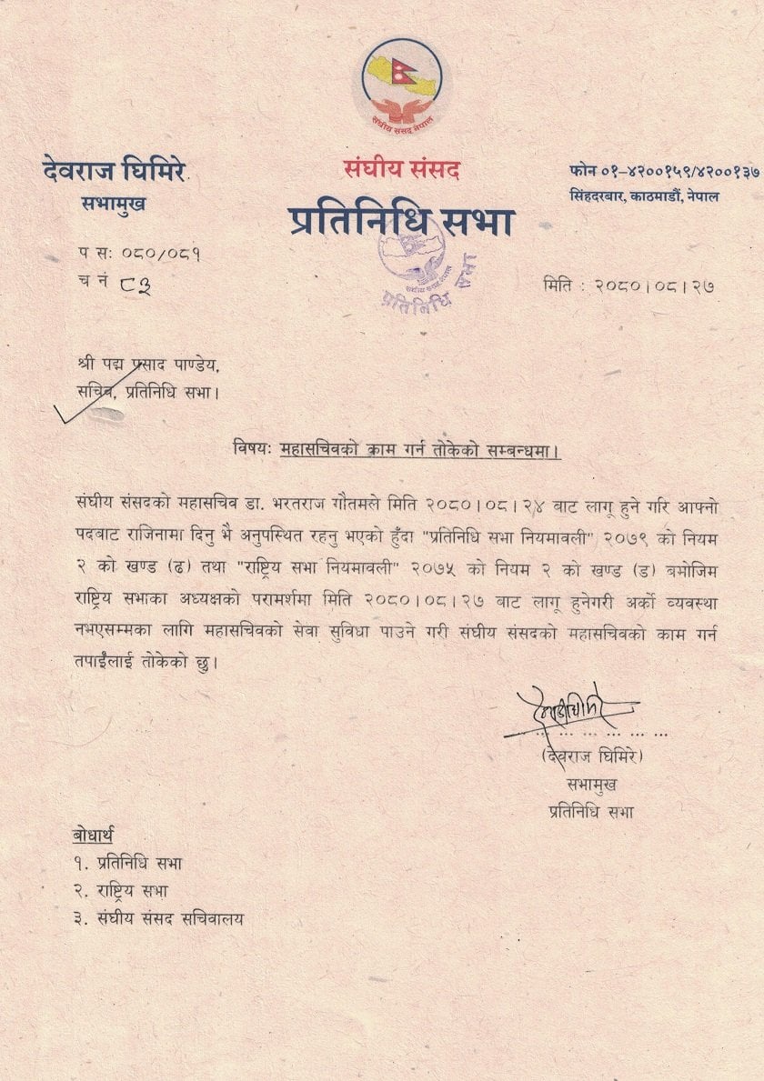 सभामुख देवराज घिमिरेले प्रतिनिधिसभाका सचिव पाण्डेयलाई महासचिवको काम गर्न तोकेका हुन् ।