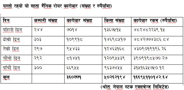 नेपाल स्टक एक्सचेन्ज लिमिटेड (नेप्से) मा यो साता तीन सय तीन वटा कम्पनीहरुको तीन लाख ६० हजार सात सय ७१ पटकको कारोबारमा पाँच करोड दुई लाख ६२ हजार एक सय ९४ कित्ता शेयर किनबेच भएका छन् । सोही किनबेचका आधारमा यो साता कुल कारोबार रकम १६ अर्ब ६९ करोड ५१ लाख १० हजार एक सय ४२ रुपैंयाँ ६४ पैसा पुग्न सफल भएको छ । यो कारोबार रकम गत साताको तुलनामा नौं अर्ब रुपैंयाँले बढी हो ।