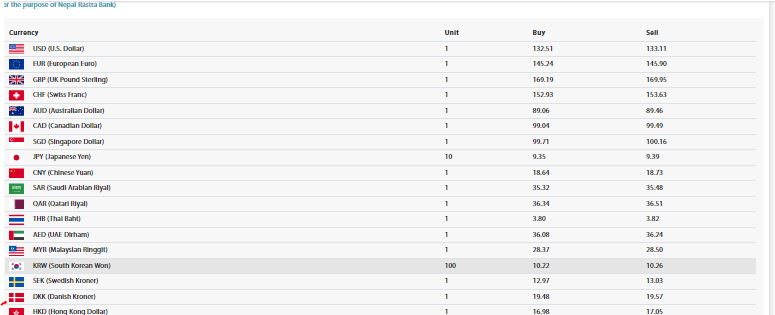 त्यस्तै, युरो एकको खरिद दर १४५ रुपैयाँ २४ पैसा र बिक्री दर १४५ रुपैयाँ ९० पैसा रहेको छ । बेलायती पाउण्ड एकको खरिद दर १६९ रुपैयाँ १९ पैसा र बिक्री दर १६९ रुपैयाँ ९५ पैसा रहेको छ ।