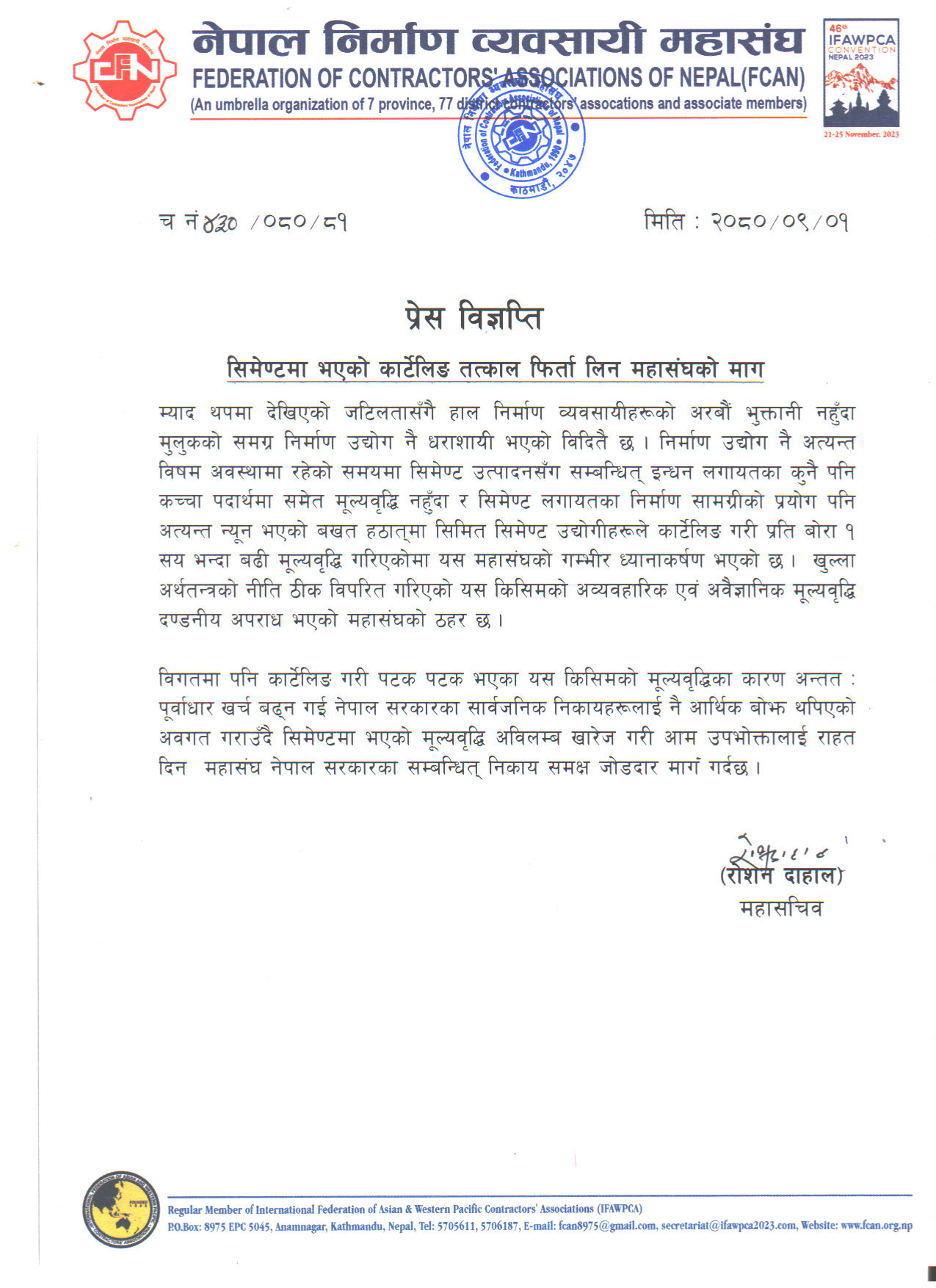 विगतमा पनि कार्टेलिङ गरी पटक पटक भएका यस किसिमका मूल्यवृद्धिका कारण अन्तत ः पूर्वाधार खर्च बढ्न गई नेपाल सरकारका सार्वजनिक निकायहरूलाई नै आर्थिक बोझ थपिएको महासंघले स्मरण गराएको छ ।