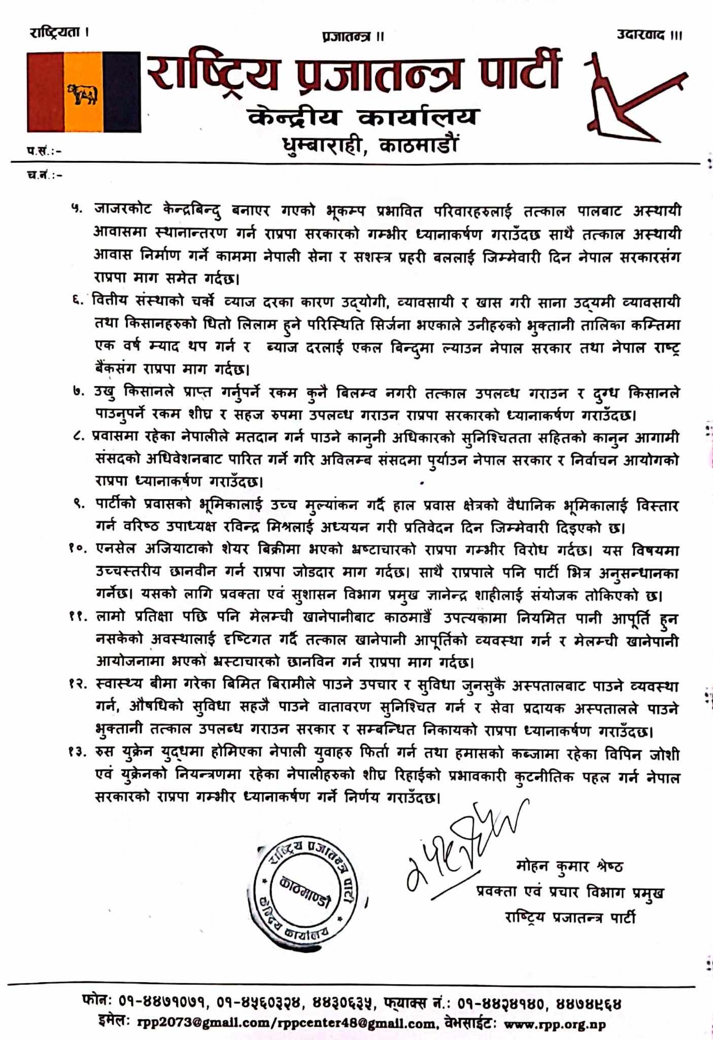 राप्रपाले मुलुककाे बिग्रदाे अर्थतन्त्र, जनतामा बढ्दाे निराशा, चरम बेराेजगारी, बढ्दाे ऋणभार, युवाशक्तिकाे विदेश पलायन, भ्रष्टाचारलगायत जनजिविकाका मुद्दाहरूका साथै राजसंस्था, सर्वधर्म समभाव पूर्ण धार्मिक स्वतन्त्रता सहितको वैदिक सनातन धर्मसापेक्ष हिन्दु राष्ट्र पुनः स्थापना र प्रदेश तहको खारेजीको लागि वृहत आन्दोलन गर्ने बताएको छ ।