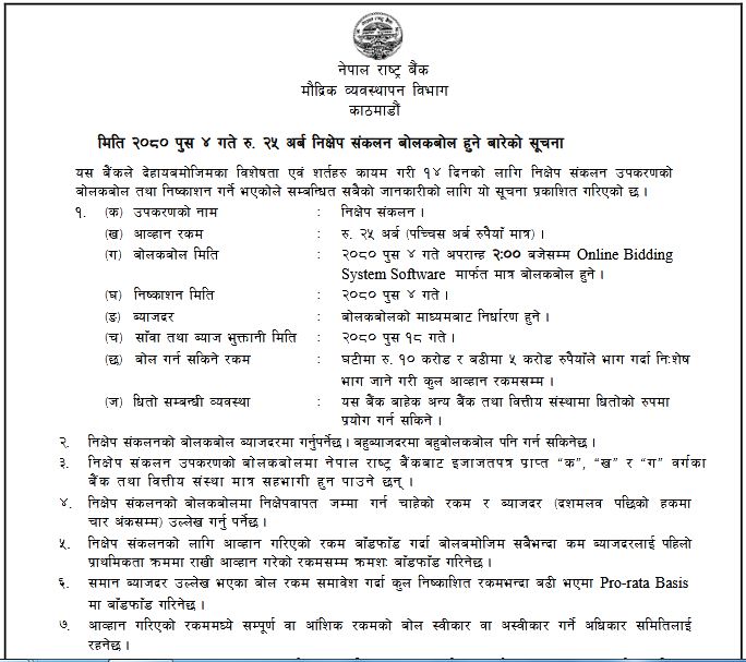 सो दिन अपरान्ह दुई बजेसम्ममा बोलकवोलको माध्यमद्धारा पुन २५ अर्बको निक्षेप उपकरण बिक्री गर्न लागिएको राष्ट्र बैंकको भनाई छ ।