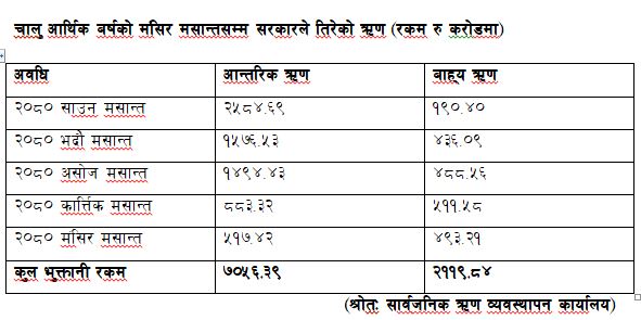 ऋण थपिंदै जाँदा सरकारले चालु आवको मसिर मसान्तसम्ममा आन्तरिक ऋणको सावाँ र व्याजको लागि ७० अर्ब ५६ करोड ३९ लाख रुपैंयाँ भुक्तानी गरेको छ भने बाह्य ऋणको सावाँ र व्याजको लागि २१ अर्ब १९ करोड ८४ लाख रुपैंयाँ भुक्तानी गरेको छ । यस अन्र्तगत आन्तरिकतर्फ साउनमा २५ अर्ब ८४ करोड ६९ लाख, भदौमा १५ अर्ब ७६ करोड ५३ लाख, असोजमा १४ अर्ब ९४ करोड ४३ लाख, कात्र्तिकमा आठ अर्ब ८३ करोड ३२ लाख र मंसिरमा पाँच अर्ब १७ करोड ४२ लाख रुपैयाँ भुक्तानी भएको कार्यालयको भनाई छ ।