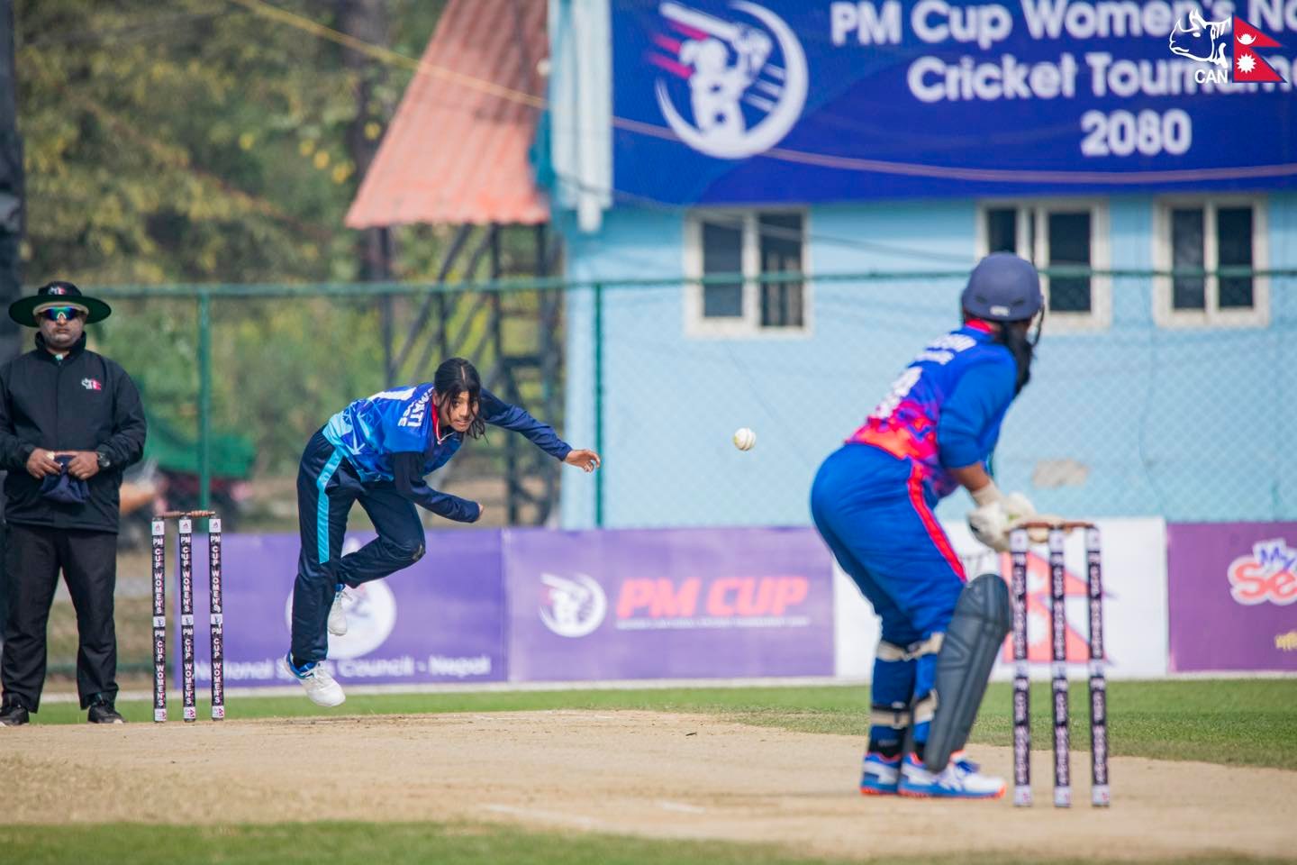 यसैगरी कप्तान अस्मिना कर्माचार्य २४ रन बनाएर रनआउटको शिकार बनिन् । अन्य कुनै पनि ब्याटरले दोहोरो अंकमा रन बनाउन सकेनन् । कन्चन श्रेष्ठले ८ रन बनाउँदा खुसी डंगोल ३ रनमा पभेलियन फर्किइन् । सलिना सिलवालले २ तथा हेलिसा गुरुङ र कृष्मा गुरुङले एक एक रन जोडे ।