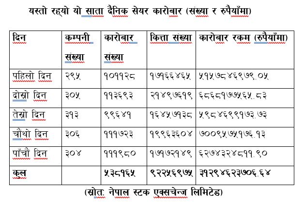 गत साता तीन सय तीन वटा कम्पनीहरुको तीन लाख ६० हजार सात सय ७१ पटक सेयर किनबेच भएको थियो । जसबाट पाँच करोड दुई लाख ६२ हजार एक सय ९४ कित्ता शेयर किनबेच हुँदा कुल कारोबार रकम १६ अर्ब ६९ करोड ५१ लाख १० हजार एक सय ४२ रुपैंयाँ ६४ पैसा कायम भएको थियो ।
