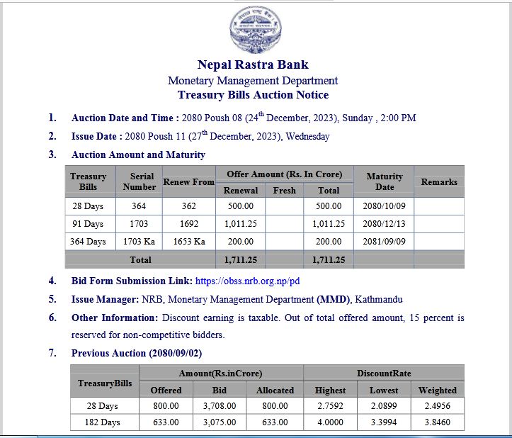 राष्ट्र बैकका अनुसार सो दिन अपरान्ह दुई बजेसम्म बोलकबोलवको माध्यमद्धारा बाँणिज्य बैंक, बिकास बैंक र फाईनान्स कम्पनीहरुलाई उक्त परिमाणमा ट्रेजरी बिल बिक्री गर्न लागिएको हो ।