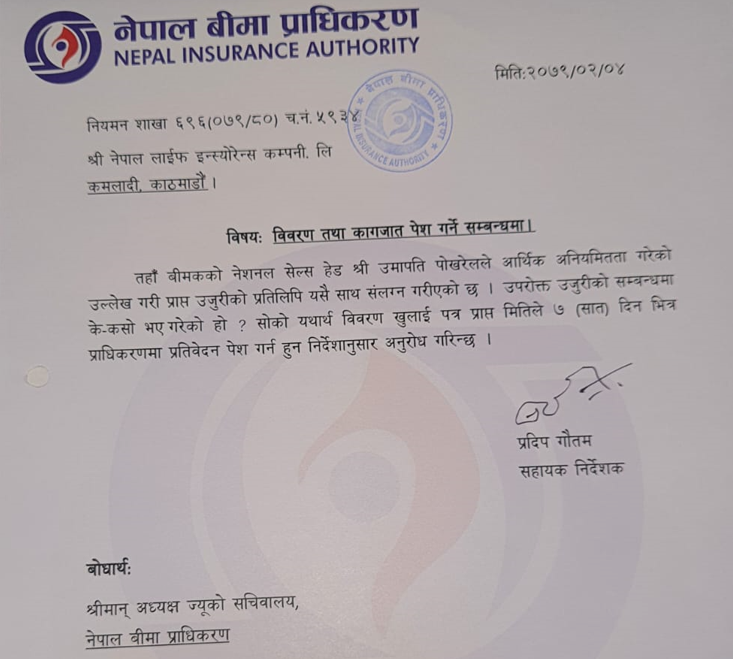 श्रोतका अनुुसार पोखरेलालाई जोगाउनको लागि पराजुलीले नियमनकारी निकाय नेपाल बीमा प्राधिकरणसंग समेत सेटिङ मिलाएका थिए । सोहीकारण बिमितको रकम हिनामिना गर्ने र गराउने दुबै चोखिए, प्राधिकरणले कारवाहीको नाउँमा स्पष्टीकरण सोध्ने मात्रको काम गरेर सुनपानी छर्किने काम गर्यो, श्रोतले भनेको छ । नेपाल लाईफमा बिमितको पैसा हिनामिना भएको प्रकरणमा प्राधिकरणका नियमन शाखाका सहायक निर्देशक प्रदिप गौतमले इन्स्योरेन्सलाई पठाएको पत्रमा उजुरीको प्रतिलिपीसहित पठाएको र सो उजुरीको सम्बन्धमा के–कसो भए/गरेको हो सोको यथार्थ विवरण खुलाई पत्र प्राप्त भएको मितिले सात दिनभित्र प्राधिकरणमा प्रतिवेदन पेस गर्न निर्देशन अनुसार अनुरोध गरिन्छ, भनिएको थियो ।