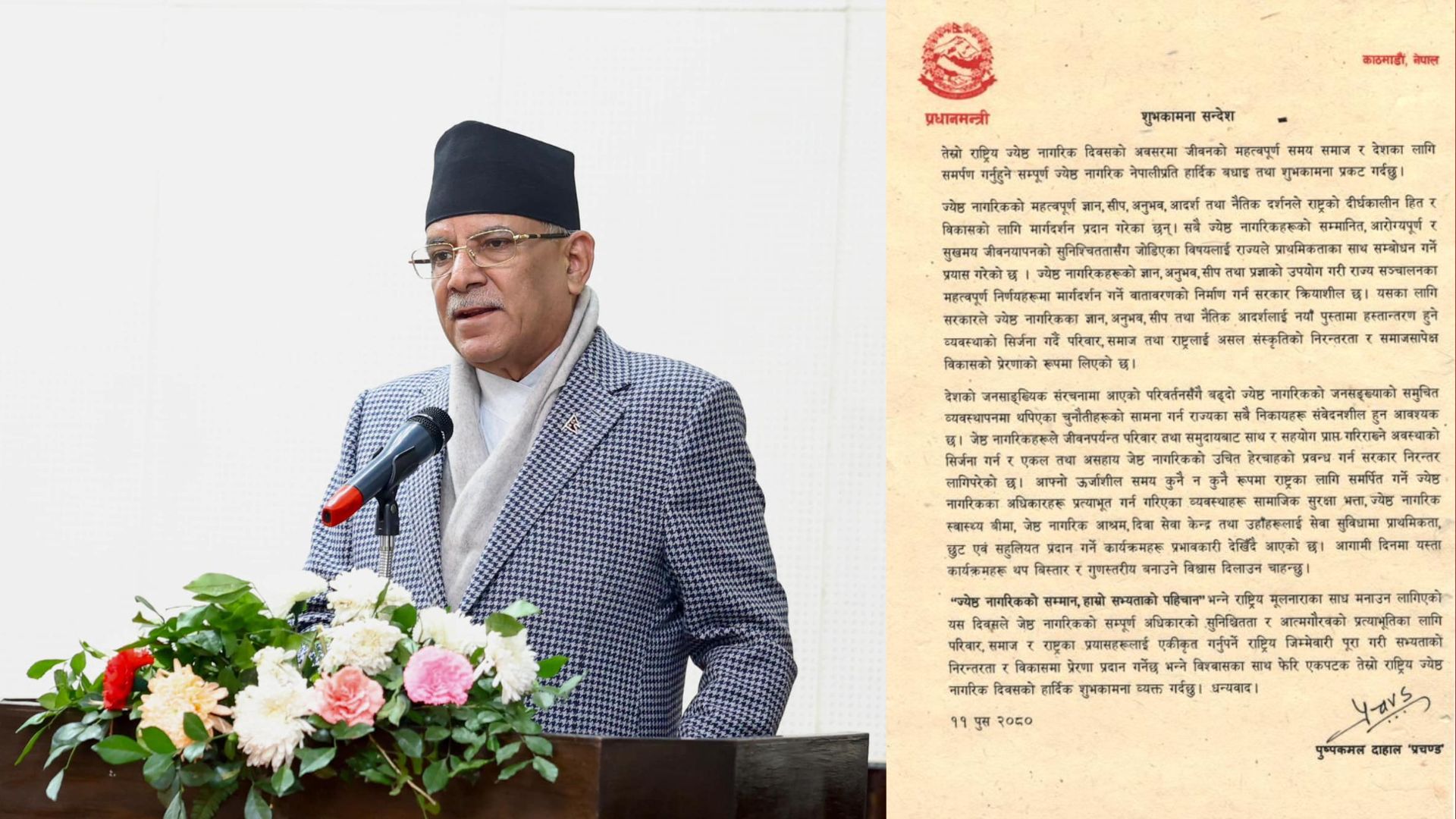 दहालले शुभकामना सन्देश जारी गर्दै ज्येष्ठ नागरिकको महत्वपूर्ण ज्ञान, सीप, अनुभव, आदर्श तथा नैतिक दर्शनले राष्ट्रको दीर्घकालीन हित र विकासको लागि मार्गदर्शन प्रदान गरेको बताएका हुन् ।