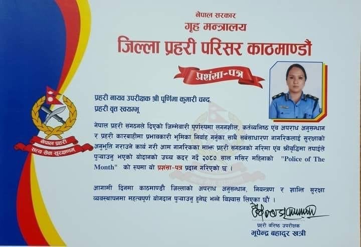 जिल्ला प्रहरी परिसर काठमाडौंले प्रहरी काम कारबाहीमा प्रभावकारी भूमिका निर्वाह गर्नुका साथै आम नागरिकलाई सुरक्षा प्रत्याभूति दिलाउन उत्कृष्ट कार्य गरेको ठहर गर्दै मंसिर महिनाको ‘पोलिस अफ द मन्थ’ घोषणा गरेको छ ।