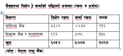 राष्ट्र बैंकका अनुसार यही पुस सात गतेसम्म बैंकिङ क्षेत्रको कुल निक्षेप ६० खर्ब ३४ अर्ब रुपैंयाँ पुगेको भने कुल कर्जा रकम ५० खर्ब सात अर्ब रुपैंयाँ पुगेको छ ।