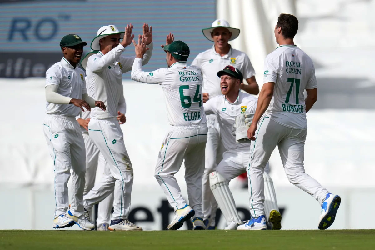 दक्षिण अफ्रिकाका कागिसो रबाडाले पाँच तथा नान्द्रे बर्गरले तीन विकेट लिए।जवाफी ब्याटिङमा उत्रिएको दक्षिण अफ्रिकाले १०८.४ ओभर खेल्दै ४०८ रन बनायो। उसका लागि डिन इलगारले १८५ रनको शतकीय पारी खेल्दा मार्को जेसनले ८४ र डेभिड बेडिन्घमले ५६ रनको अर्धशतकीय पारी खेले ।