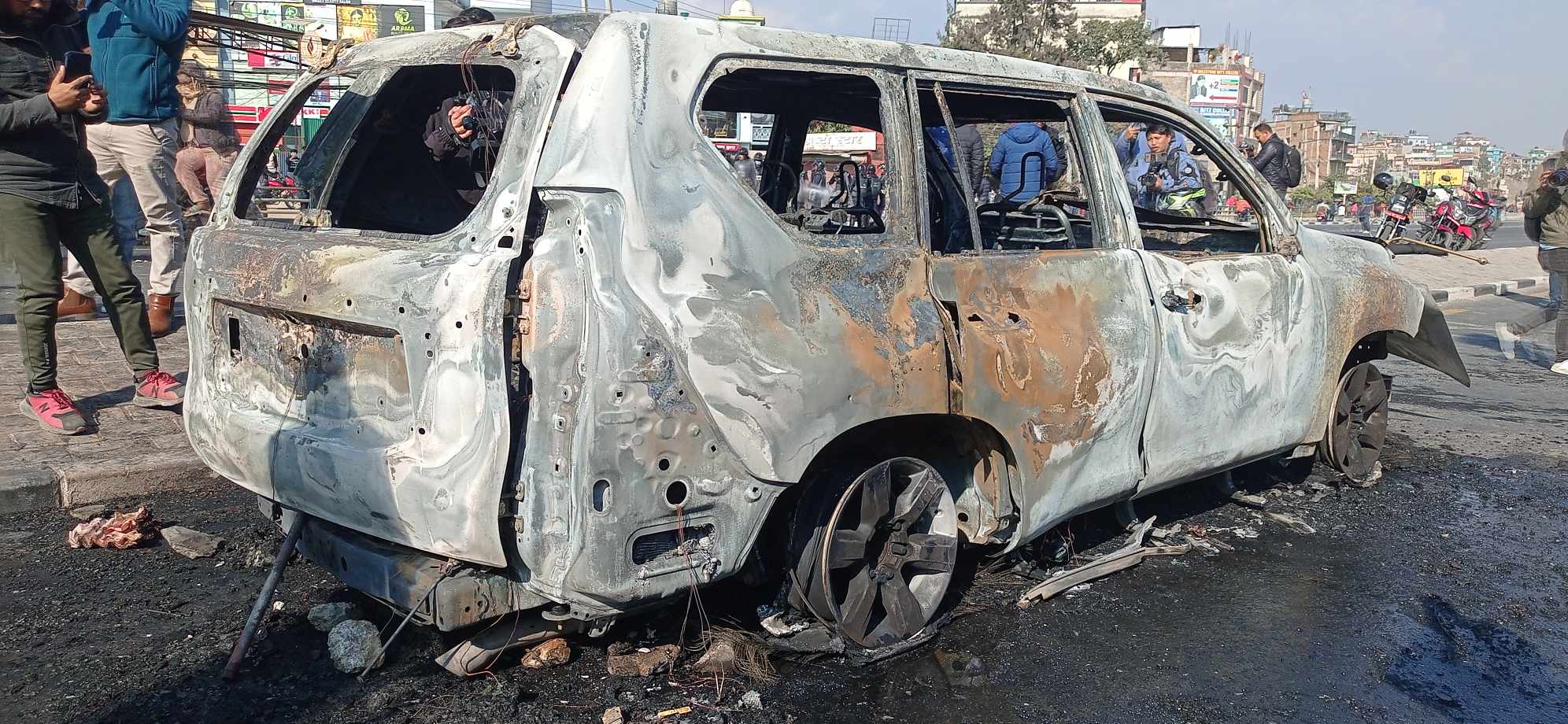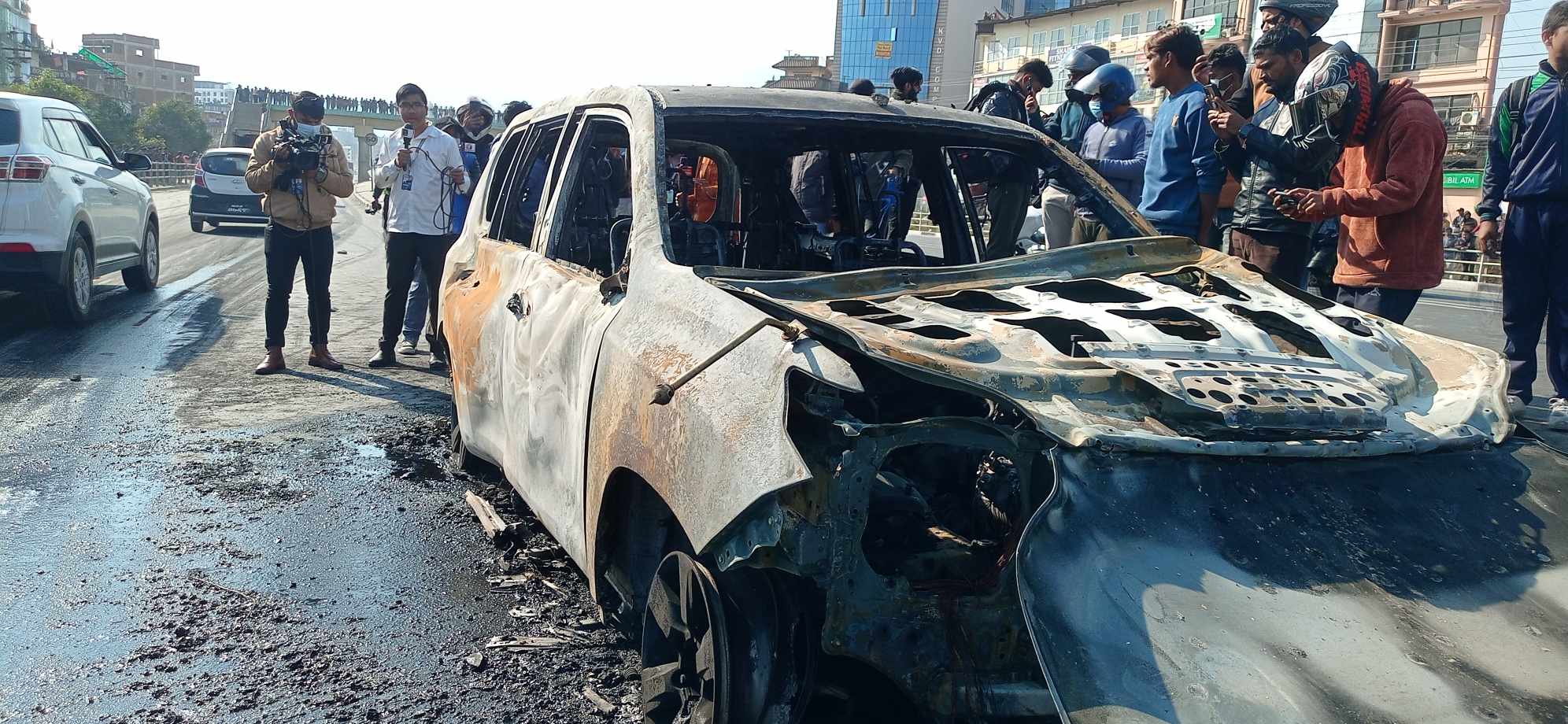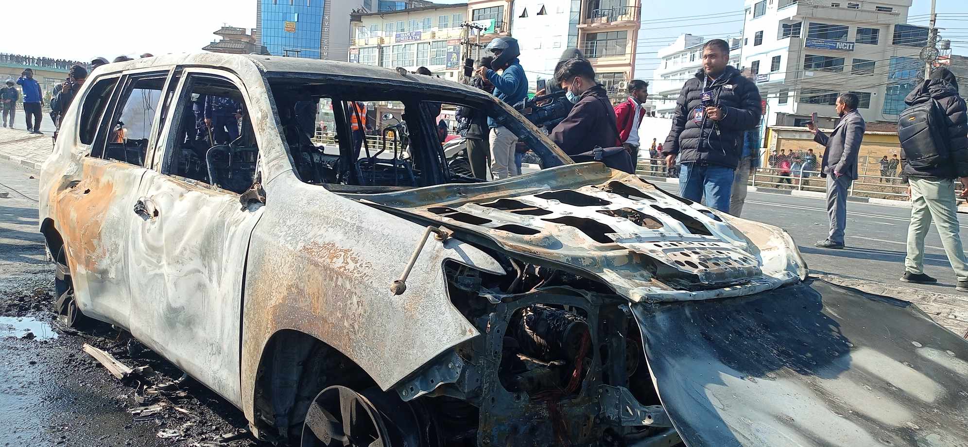 हेर्नुहोस् आगजनी गरिएको मन्त्रीको गाडी :