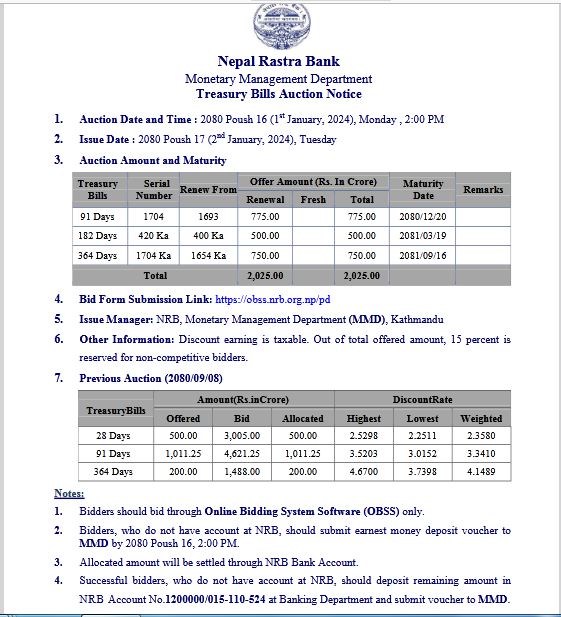 पुस १७ गते मंगलबार जारी मिती तोकिएको ट्रेजरी बिल खरिदको लागि वाणिज्य बैंक, विकास बैंक र फाइनान्स कम्पनीहरुले बोलकबोल पेस गर्न सक्ने छन् ।