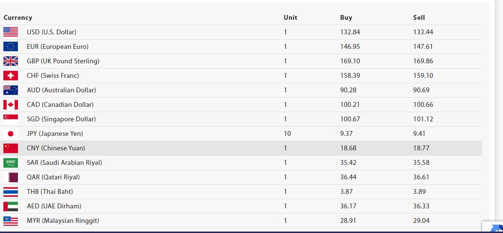 काठमाडौं । नेपाल राष्ट्र बैंकले आज (आइतबार)का लागि विदेशी मुद्राको विनिमयदर तोकेको छ । आज अमेरिकी डलर एकको खरिद दर १३२ रुपैयाँ ८४ पैसा र बिक्री दर १३३ रुपैयाँ ४४ पैसा रहेको छ ।