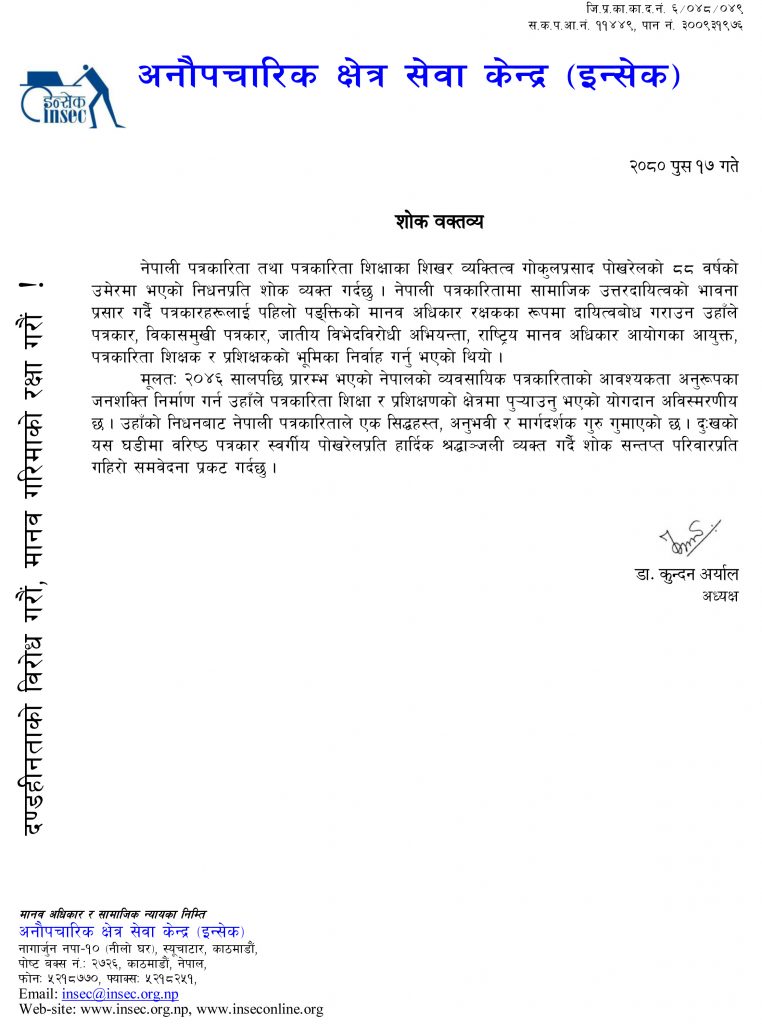 इन्सेकका अध्यक्ष डा. कुन्दन अर्यालले पुस १७ गते एक शोक वक्तव्य जारी गर्दै दुःखको यस घडीमा वरिष्ठ पत्रकार स्वर्गीय पोखरेलप्रति हार्दिक श्रद्धाञ्जली व्यक्त गरेका छन् ।