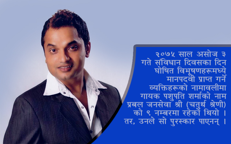 काठमाडौं । सरकारले गायक पशुपति शर्मालाई प्रबल जनसेवा श्री (चतुर्थ श्रेणी) प्रदान गर्ने निर्णय गर्यो । तर, सो प्रबल जनसेवा श्री पुरस्कार शर्माले पाएनन् ।