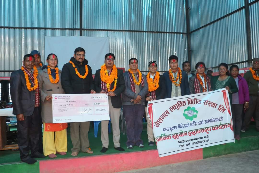 यसका साथै आगामी दिनमा पनि दुर दराजमा रहेका विपन्न गरिव परिवारमा वित्तीय सेवा पुर्याउन आग्रह समेत गरे । सोही अवसरमा नेशनल लघुवित्तका सिइयो राम बहादुर यादवले मानवीय सहायतामा सधै नेशनल लघुवित्त साथ रहने बताए । मानवीय सहायता गर्ने अवसर दिएकोमा गाउँपालिका तथा नगरपालिकालाई धन्यवाद समेत व्यक्त गरेको थिए । दुर्गम गाउँ बस्तीहरुमा आफ्ना सेवाग्राही सदस्यहरुलाई सामाजिक तथा आर्थिक उत्थानका लाथि लघुवित्त कार्यक्रको माध्यमबाट गरिवी न्यूनिकरणमा टेवा पुर्याउने सिइओ यादवले बताए ।