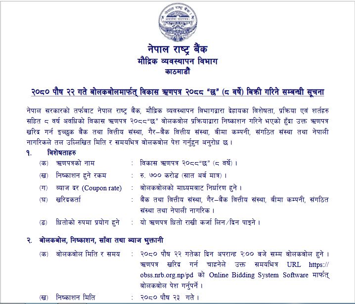 सो दिन आठ बर्षे अवधिको बिकास ऋणपत्र २०८८“छ” (८ वर्षे) बोल कबोलको माध्यमद्वारा बिक्री गर्न लागिएको राष्ट्र बैंकको भनाई छ ।