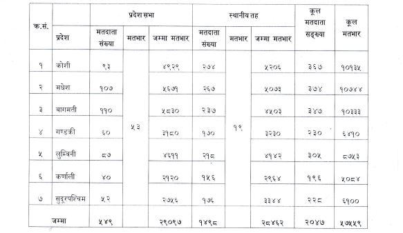 निर्वाचन आयोगका प्रवक्ता शालिकराम शर्मा पौडेलले दिएको जानकारी अनुसार कोशी प्रदेशमा प्रदेश सभा सदस्य तर्फको मतदाता संख्या ९३ तथा गाउँपालिका अध्यक्ष र उपाध्यक्ष तथा नगरपालिकाका प्रमुख उपप्रमुख तर्फको मतदाता संख्या २७४ गरी कुल ३६७ रहेका छन् । सो अनुसार कोशी प्रदेशमा प्रदेश सभा सदस्यको मतभार ४९२९ र गाउँपालिका अध्यक्ष र उपाध्यक्ष तथा नगरपालिकाका प्रमुख र उपप्रमुख तर्फको मतभार ५२०६गरी जम्मा १०१३५ रहेको छ ।