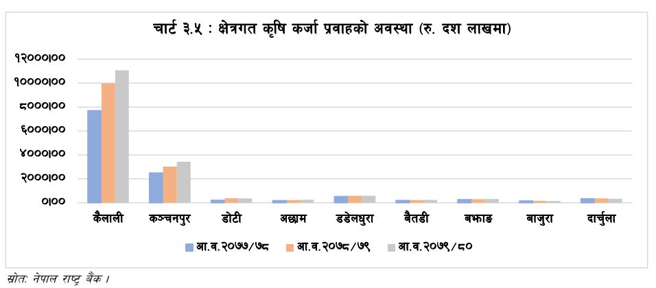 कृषि क्षेत्रमा प्रवाहित कर्जामध्येकैलाली जिल्लाको अंश ६६ दशमलव १२ प्रतिशत, कञ्चनपुरको २० दशमलव ४७ प्रतिशत, डडेलधुरा, डोटी, दार्चुला, बझाङ, अछाम, बैतडी, तथा बाजुराको अंश क्रमशः तीन दशमलव ५२ प्रतिशत, दुई दशमलव २० प्रतिशत, एक दशमलव ९३ प्रतिशत, एक दशमलव ८९ प्रतिशत, एक दशमलव ५५ प्रतिशत, एक दशमलव ४१ प्रतिशत र शुन्य दशमलव ९० प्रतिशत रहेको छ ।
