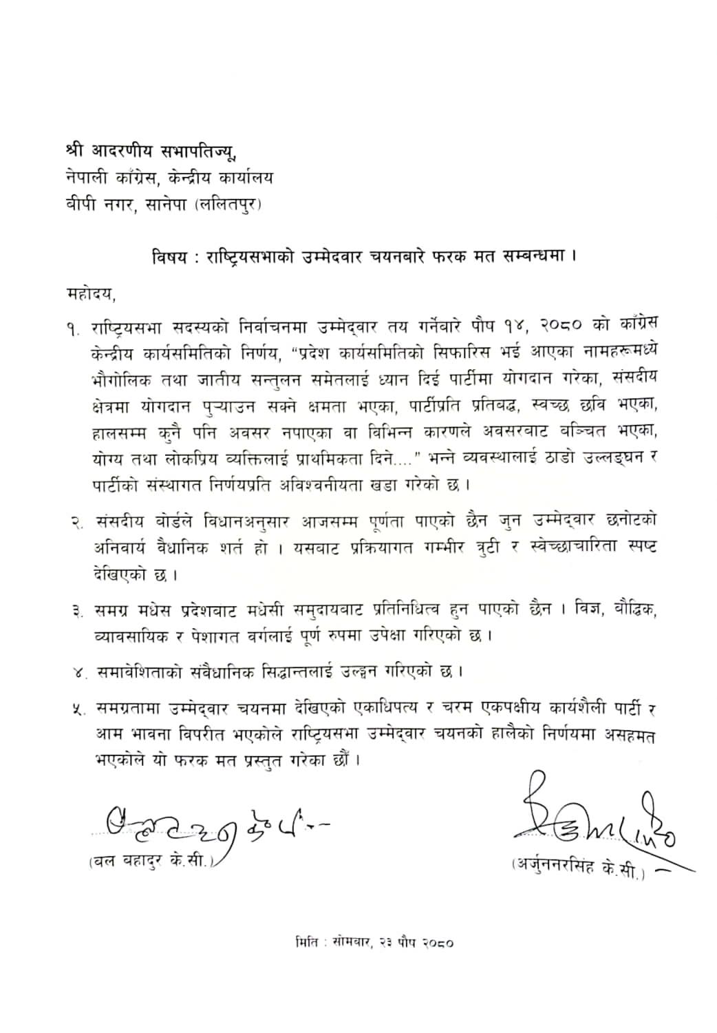 कांग्रेस केन्द्रीय कार्यसमितिको निर्णय विपरीत उम्मेदवार चयन गर्ने काम भएको भन्दै नेताहरु अर्जुननरसिंह केसी र बलबहादुर केसीले ५ फरक मत राखेका हुन् ।
