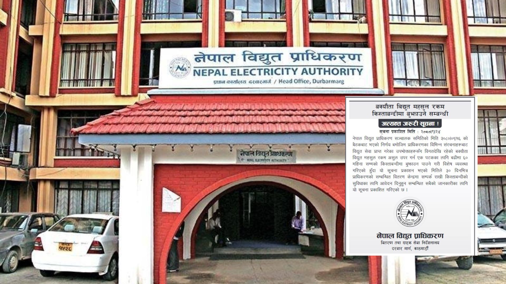 ‘विगतदेखि रहेको बक्यौता विद्युत महसुल रकम असुल उपर गर्न एक पटकका लागि बढीमा ६० महिना सम्मको किस्ताबन्दीमा बुझाउन पाउने गरी विशेष व्यवस्था गरिएको हुँदा यो सूचना प्रकाशन भएको मितिले ३० दिनभित्र प्राधिकरणको सम्बन्धित वितरण केन्द्रमा सम्पर्क राखी किस्ताबन्दीको सुविधाका लागि आवेदन दिनुहुन सम्बन्धित सबैको जानकारीका लागि यो सूचना प्रकाशित गरिएको छ,’ प्राधिकरणले भनेको छ ।