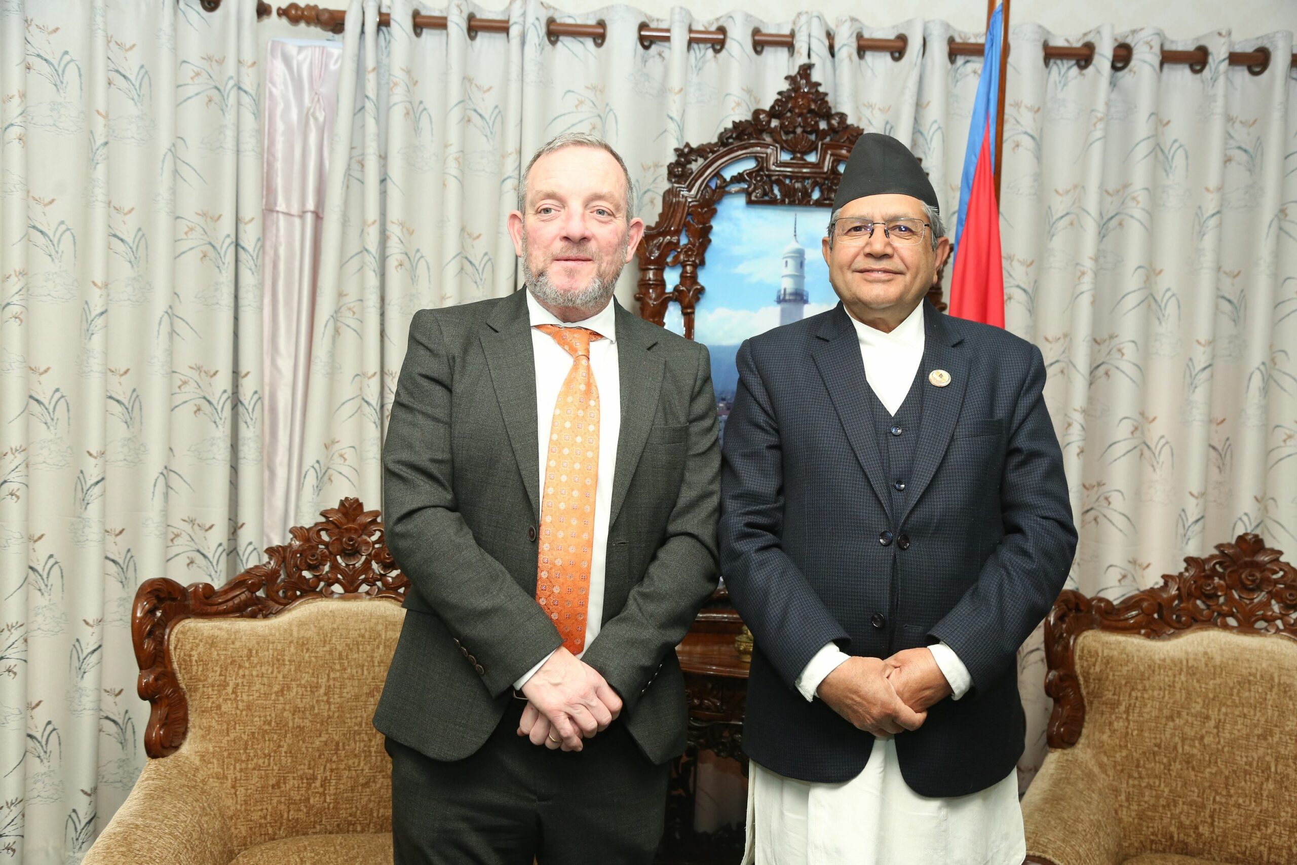 काठमाडौं । सभामुख देवराज घिमिरे र आयरल्याण्डको माथिल्लो सभा शाअनड एरेनका अध्यक्ष जेरी बट्टिमरबीच शिष्टाचार भेट भएको छ ।नेपालको पाँच दिने औपचारिक भ्रमणमा आएका अध्यक्ष बट्टिमरले सभामुख घिमिरेलाई सिंहदरबारस्थित सभामुखको कार्यकक्षमा भेट गरेका हुन्