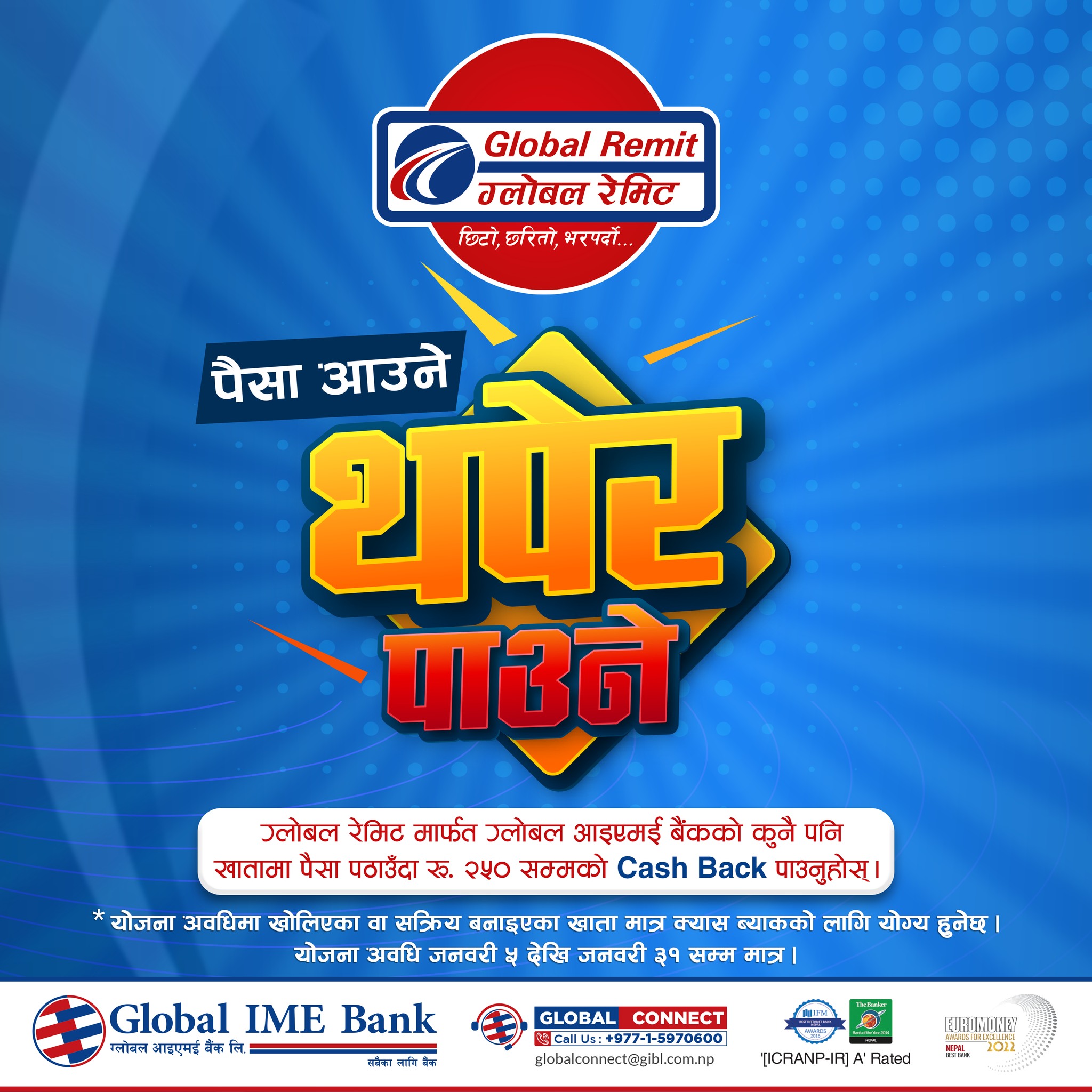 ग्लोबल आइएमई बैैकमा नयाँ खाता खोलेर वा निष्क्रिय खातालाई पूनः सक्रिय बनाएर उक्त खातामा ग्लोबल रेमिटमार्फत पैसा पठाउँदा बैंकले रेमिट्यान्समार्फत आएको पैसामा २५० रुपैयाँ सम्म थप गरिदिनेछ ।