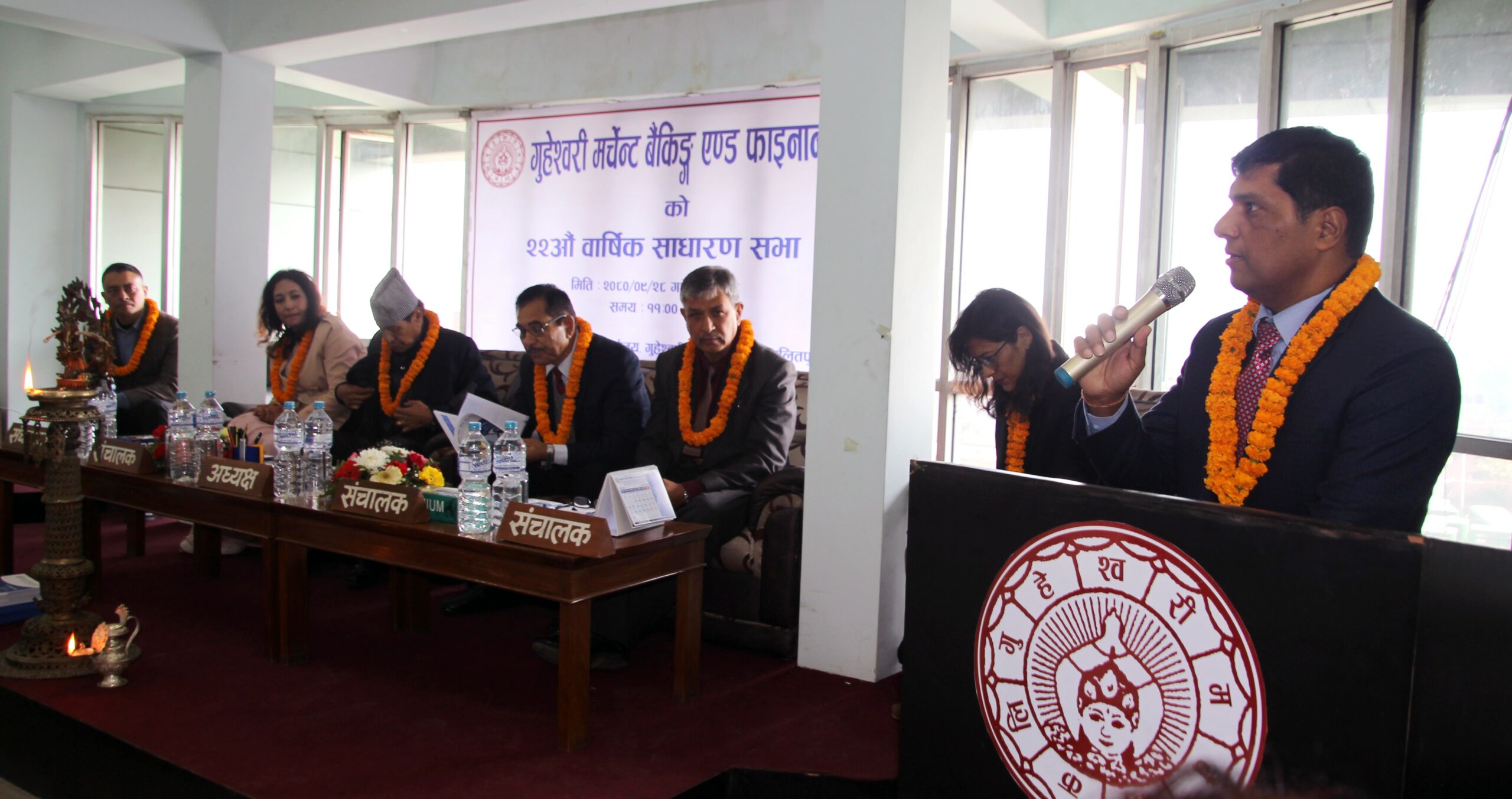 गुहेश्वरी मर्चेन्ट बैंकिङ्ग एण्ड फाइनान्स लिमिटेडको २२ औं वार्षिक साधारण सभा शनिवार सम्पन्न भएको छ । गुहेश्वरी भवन, पुल्चोक ललितपुरमा सम्पन्न साधारण सभामा फाइनान्स संचालक समितिका अध्यक्ष युवराज भण्डारीले आ.व. २०७९/८० को वार्षिक प्रतिवेदन पेश गरेका थिए । अध्यक्षद्वारा पेशगरिएको प्रतिबेदनलाई छलफल गरि पारित गरिएको थियो ।