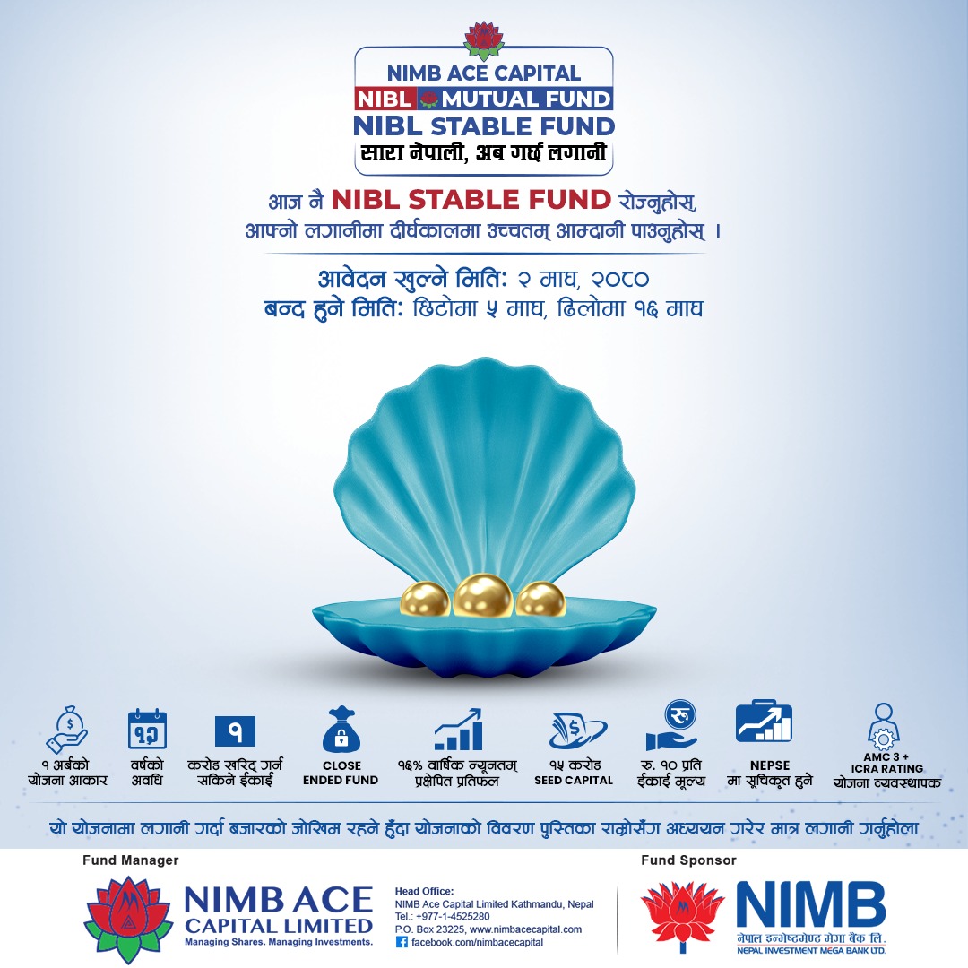 काठमाडौं । नेपाल इन्भेष्टमेन्ट मेगा बैंक लिमिटेड, कोष प्रबद्र्धक तथा एनआइएमबि एस क्यापिटल लि. योजना व्यवस्थापक तथा डिपोजिटरी रहेको एनआईबिएल म्युचुअल फण्ड अन्तर्गत संचालन हुने छैठौं योजना “एनआईबिएल स्टेवल फण्ड” को सार्वजनिक निश्कासन २०८० माघ २ गतेबाट सुुरु भएको छ ।