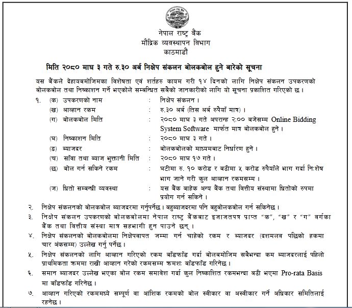 सो दिन अपरान्ह दुई बजेसम्ममा बोलकवोलको माध्यमद्वारा पुन: ३० अर्बको निक्षेप उपकरण बिक्री गर्न लागिएको राष्ट्र बैंकको भनाई छ ।