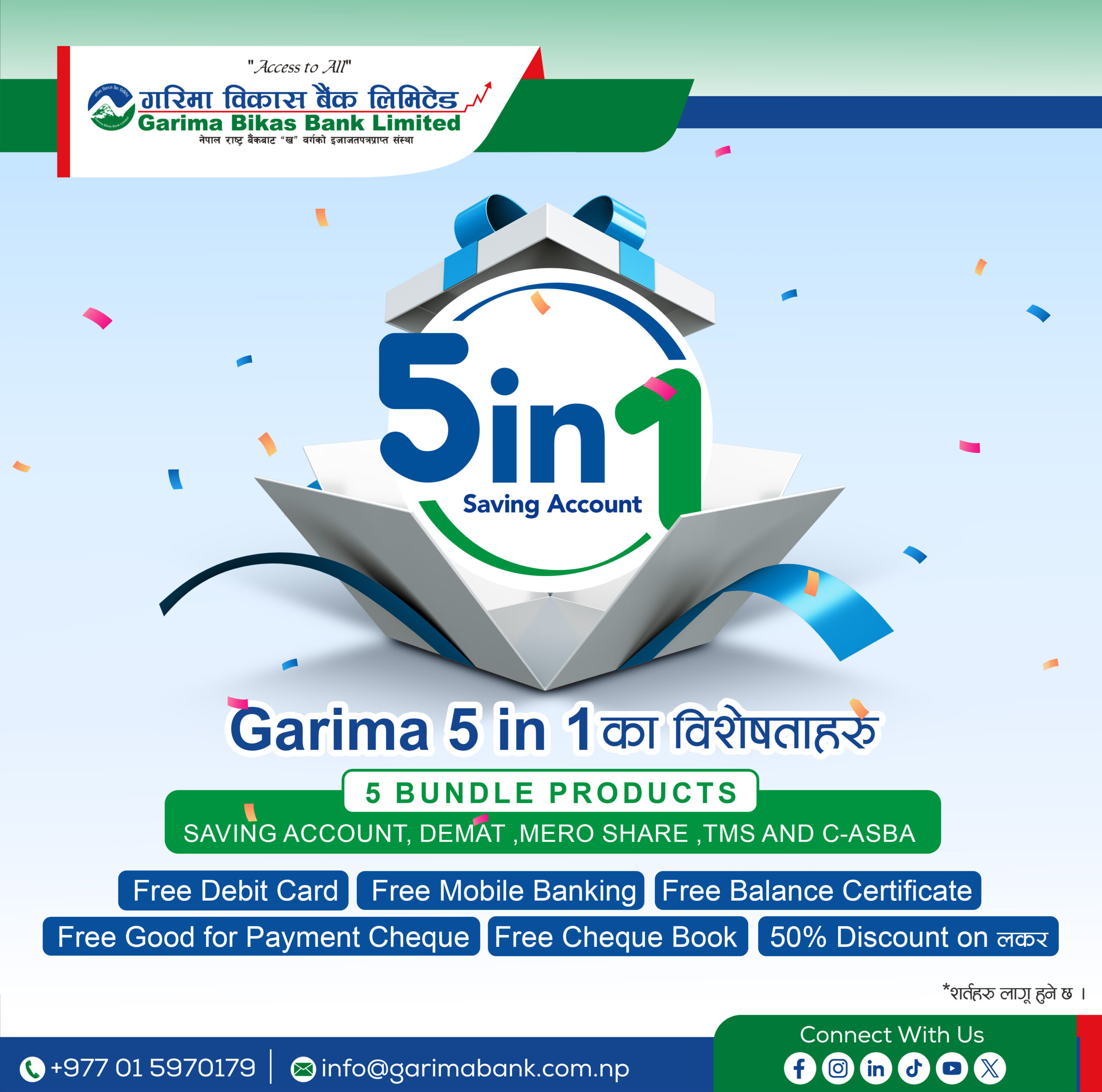 गरिमा 5 in 1 बचत खातामा ग्राहकहरुले बचत खाता, डिम्याट खाता, सेयर ट्रेडिङ खाता, मेरो शेयरको र सि आस्वा सेवाका लागि एकै पटक वा छुट्टाछुट्टै आवेदन दिन सक्ने बैंकले जनाएको छ ।