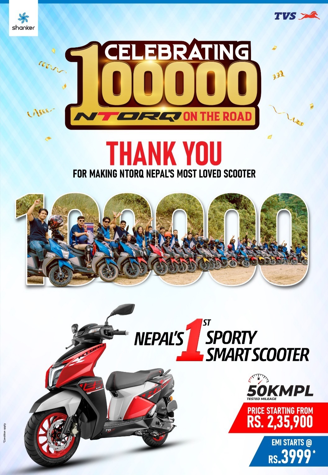 एनटर्कले नेपालमा १२५ सीसीको स्कुटर बजारमा नयाँ क्याटेगोरी मात्र नथपेर नेपाली ग्राहकहरुको लागि प्रशस्त छनोटका अवसरहरु प्रदान गर्दै विकासको नयाँ युगको सुरुवात गरेको छ । एक लाख स्कुटर बिक्री भएको उपलक्ष्यमा टिभिएस् एनटर्क अहिले ३,९९९ को मासिक किस्तामा उपलब्ध छ ।