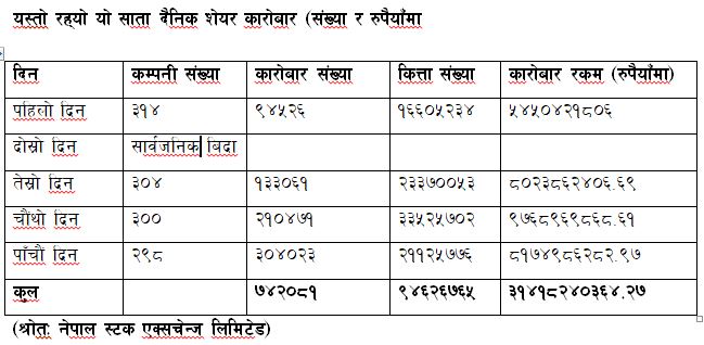 धितोपत्र बजारमा यो साता तीन सय १४ वटा कम्पनीहरुको सात लाख ४२ हजार ८१ पटक सेयर किनबेच भएको छ । जसबाट नौं करोड ४६ लाख २६ हजार सात सय ६५ कित्ता शेयर खरिद–बिक्री हुुँदा सातामा ३१ अर्ब ४१ करोड ८२ लाख ४० हजार तीन सय ६४ रुपैंयाँ २७ पैसाको सेयर किनबेच हुन पुगेको छ । यो कारोबार रकम गत साताको तुलनामा झण्डै छ अर्ब रुपैंयाँले बढी हो । गत साता धितोपत्र बजारमा २५ अर्ब ४७ करोड ७५ लाख ६३ हजार दुई सय १९ रुपैंयाँ ४५ पैसाको सेयर किनबेच भएको थियो । उक्त साता तीन सय नौं वटा कम्पनीहरुको चार लाख ७४ हजार सात सय ६६ पटकको कारोबारमा आठ करोड २५ लाख ३७ हजार नौं सय ५१ कित्ता शेयर खरिद–बिक्री हुँदा उक्त परिमाणमा रकम कारोबार भएको हो ।