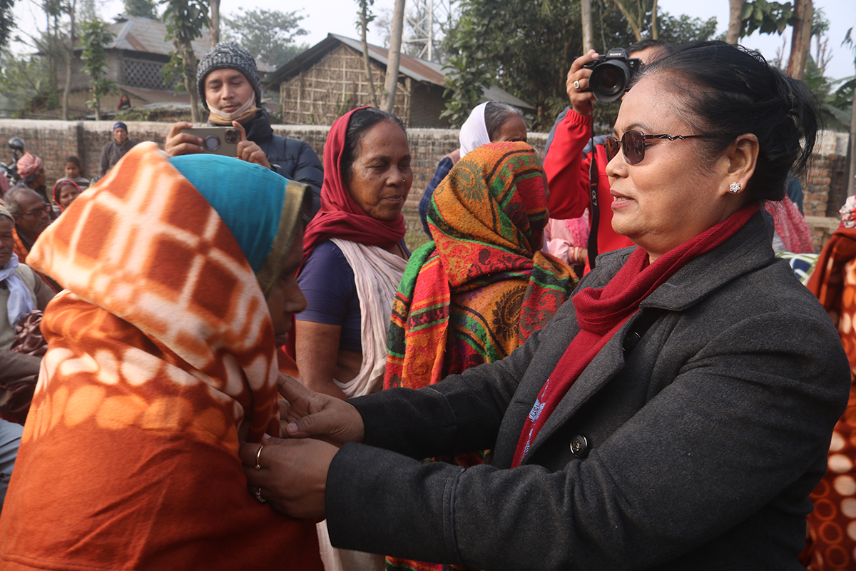 सांसद चौधरीले शुक्रबार बर्जु वडा नं. ४ का गरिब, विपन्न तथा असहाय नागरिकलाई शितलहरबाट बचाउन ब्ल्याङ्केट, म्याट्रेसजस्ता सामाग्री वितरण गरेकी हुन् । नेकपा एमाले बर्जु वडा नं. ४ को भेला समेत रहेको कार्यक्रममा बोल्दै चौधरीले समाज रुपान्तरण र समाजमा ब्याप्त गरिबी, असमानता र विभेद गर्ने एक मात्र पार्टी नेकपा एमाले भएको बताउँदै तराईका जनता शितलहरबाट आक्रान्त भइरहँदा राज्यले नदेख्नु दुर्भाग्य भएको बताइन् ।