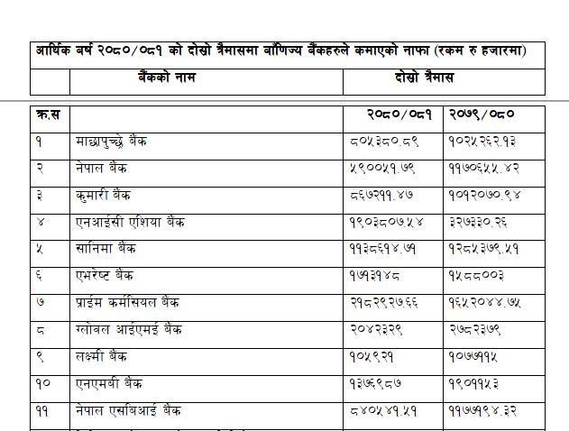 अपरिष्कृत वित्तीय विवरण अनुसार चालु आवको दोस्रो त्रैमासमा सबैभन्दा बढी नाफा नबिल बैंकले कमाएको छ । नबिलले तीन अर्ब २० करोड ३० लाख ७९ हजार रुपैंयाँ खुद मुनाफा कमाउँदा ग्लोवल आईएमई बैंकले दुई अर्ब चार करोड २३ लाख २९ हजार रुपैंयाँ खुद मुनाफा कमाएको छ । गत आवको सोही अवधिमा नबिलले तीन अर्ब ४१ करोड ७६ लाख ९८ हजार रुपैंयाँ खुद मुनाफा कमाउँदा ग्लोवलले दुई अर्ब ७८ करोड २३ लाख ७९ हजार रुपैंयाँ खुद मुनाफा कमाएको थियो ।
