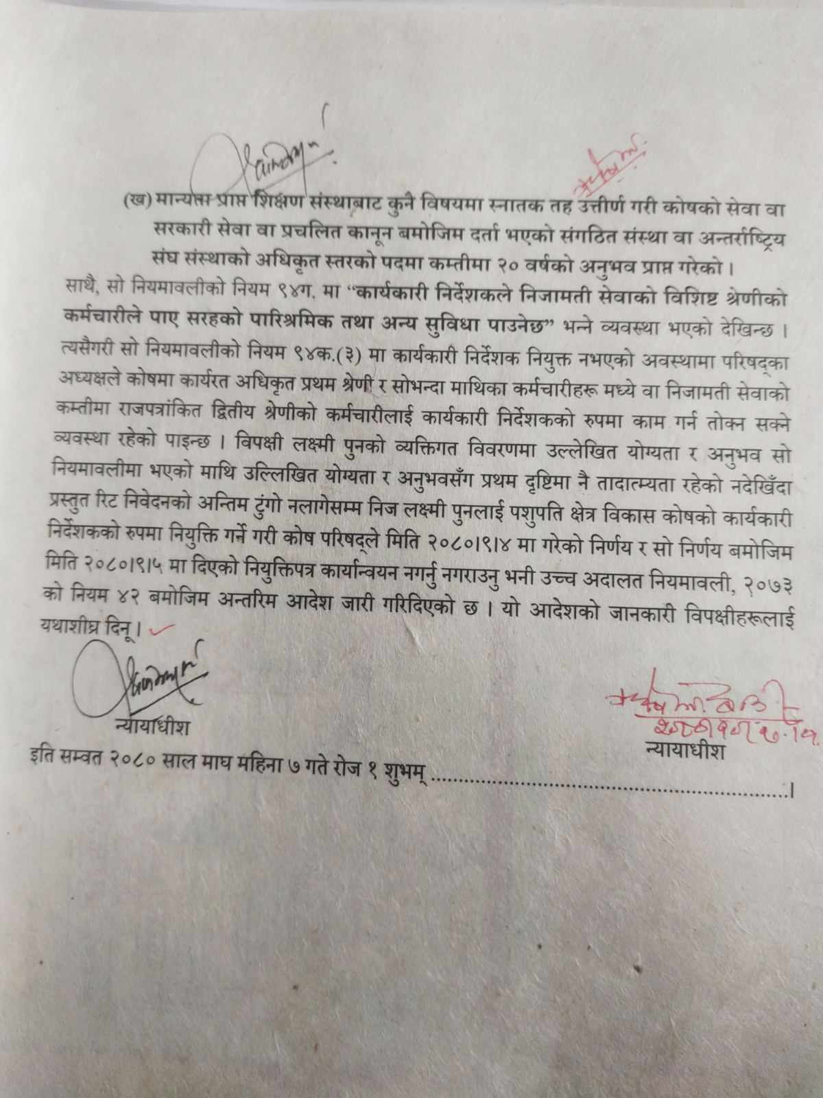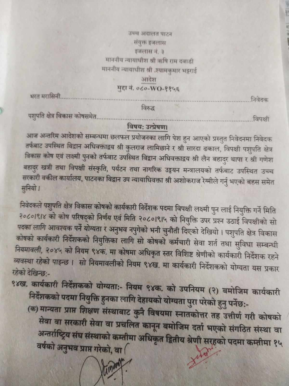 योग्यता र मापदण्ड नपुगेको व्यक्तिलाई नियुक्त गरिएको भन्दै भरत मरासिनीले २६ पुसमा कार्यकारी निर्देशक पुन विरुद्ध उच्च अदालत पाटनमा रिट निवेदन दर्ता गरेका थिए ।