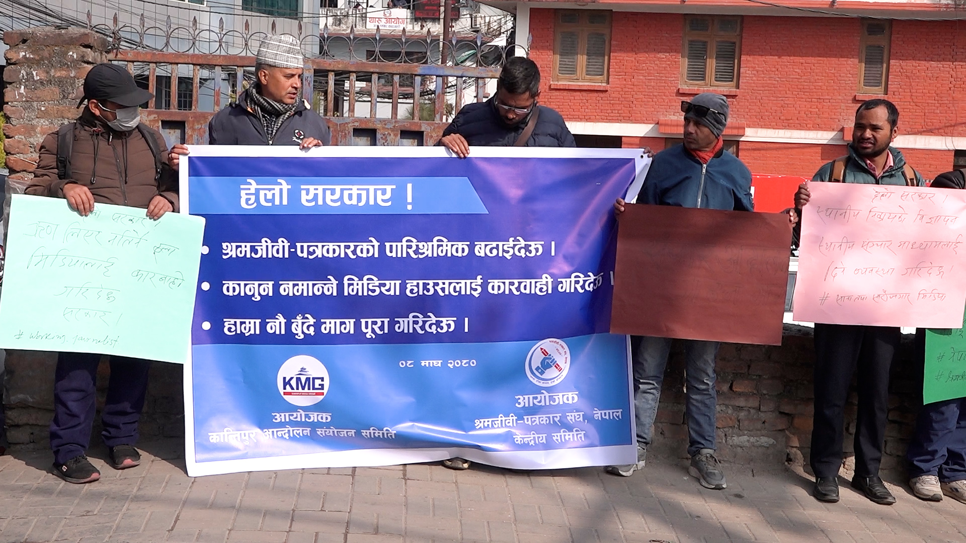 सोमबार काठमाडौंमा श्रमजीवि पत्रकार संघले श्रमजीवि पत्रकारहरुको पारिश्रमिक बढाउन साथै कानुन नमान्ने मिडिया हाउसलाई कारबाहीको माग गर्दै धर्ना दिएका हुन् ।