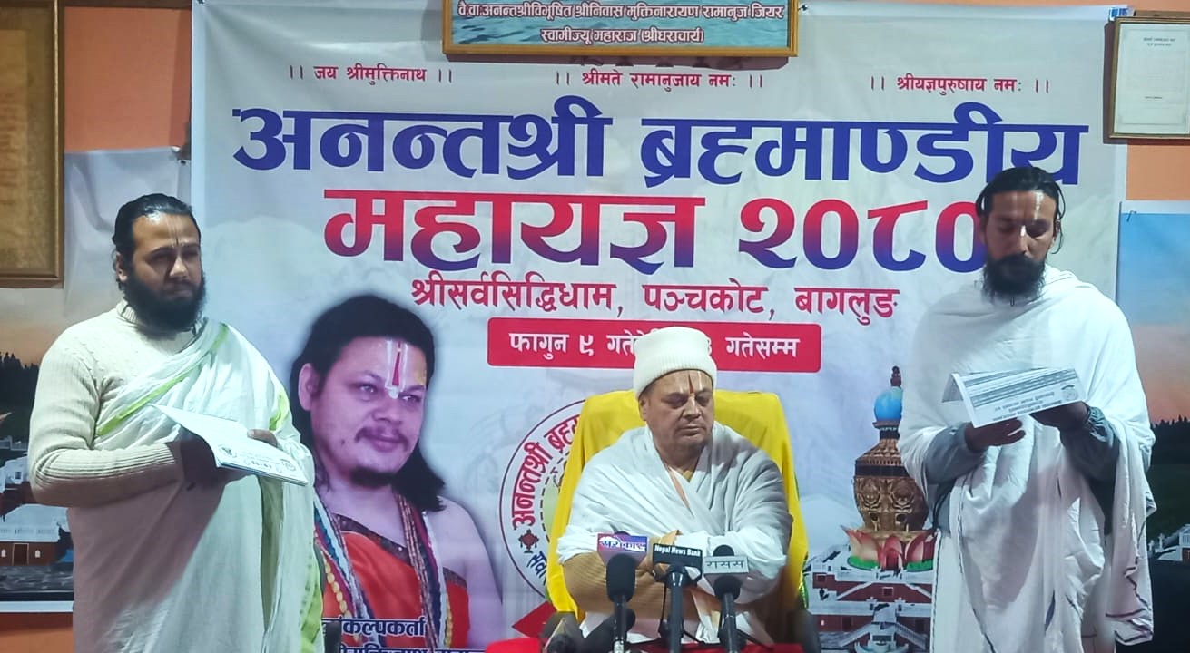 समितिले आगामी फाल्गुन ९ गतेदेखि २३ गतेसम्म विश्वप्रसिद्ध मुक्तिक्षेत्रमा अवस्थित राष्ट्रकै महत्वपूर्ण धार्मिक एवं पर्यटकीय जिल्ला बाग्लुङको सर्वसिद्धिधाम पञ्चको अनन्तश्री ब्रह्माण्डीय महायज्ञ–२०८० आयोजना गर्न लागेको जानकारी दिएको हो ।