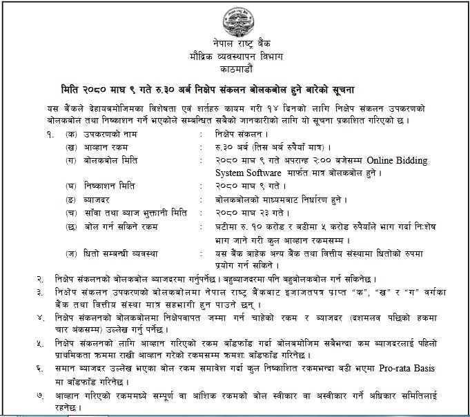 काठमाडौं । नेपाल राष्ट्र बैंकले वित्तीय प्रणालीमा भएको अधिक तरलता खिच्नको लागि माघ नौ गते मंगलबार पुन: ३० अर्ब रुपैयाँको निक्षेप उपकरण बिक्री गर्ने भएको छ । सो दिन अपरान्ह दुई बजेसम्ममा बोलकवोलको माध्यमद्वारा पुन: ३० अर्बको निक्षेप उपकरण बिक्री गर्न लागिएको राष्ट्र बैंकको भनाई छ ।