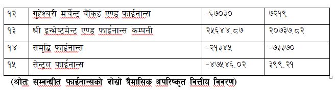 अपरिष्कृत वित्तीय विवरण अनुसार चालु आवको दोस्रो त्रैमासमा रिलायन्स, प्रोगेसिभ, गुहेश्वरी मर्चेन्ट एण्ड बैंकिङ, समृद्धि र सेन्ट्रल फाईनान्सले खुद नोक्सानी बेहोरेका छन् । यि फाईनान्सहरुले पछिल्लो अवधिमा क्रमश पाँच करोड ४७ लाख ६५ हजार, १० करोड ५७ लाख ५० हजार, छ करोड ७० लाख ३० हजार, दुई करोड १३ लाख ४५ हजार र चार करोड ७५ लाख ४६ हजार रुपैयाँ खुद नोक्सानी बेहोरेका छन् ।