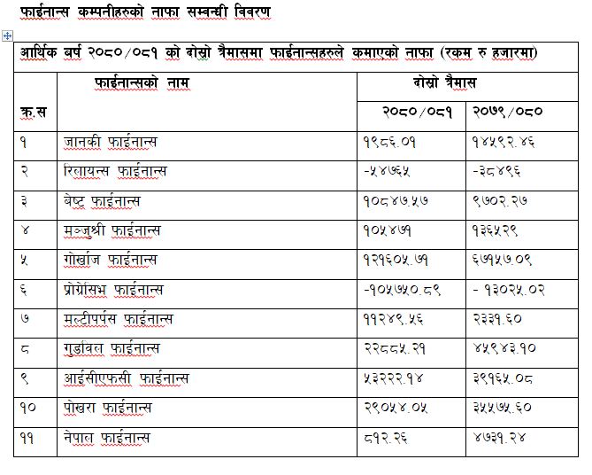 गत आवको सोही अवधिमा यि फाईनान्सहरुको यस्तो नाफा २३ लाख ३१ हजार, चार करोड ५९ लाख ४३ हजार र तीन करोड ९१ लाख ६५ हजार रुपैयाँ रहेको थियो । पोखरा, नेपाल फाईनान्स र श्री इन्भेष्टमेन्ट फाईनान्सले भने पछिल्लो अवधिमा क्रमश: दुई करोड ९० लाख ५४ हजार, आठ लाख १२ हजार र दुई करोड ५६ लाख ४४ हजार रुपैयाँ खुद मुनाफा कमाएका छन् । गत आवको सोही अवधिमा यी फाईनान्सहरुको यस्तो नाफा क्रमशः तीन करोड ५५ लाख ७५ हजार, ४७ लाख ३१ हजार र दुई करोड सात लाख ३७ हजार रुपैयाँ रहेको थियो ।