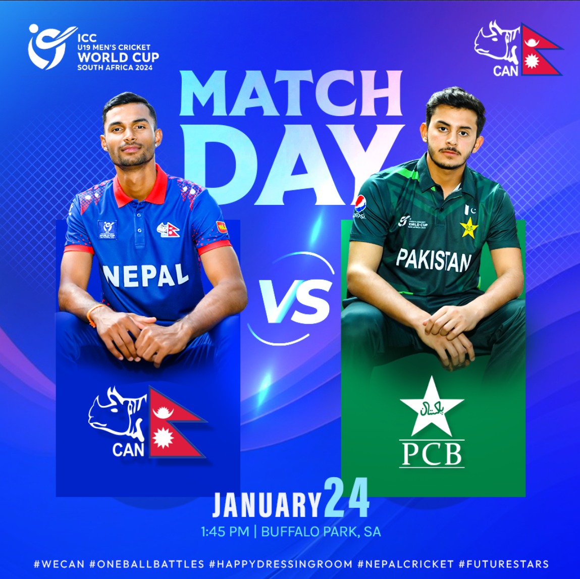 काठमाडौं । दक्षिण अफ्रिकामा जारी आइसीसी यू–१९ विश्वकप क्रिकेट प्रतियोगितामा नेपालले आज पाकिस्तानसँग प्रतिस्पर्धा गर्दै छ । समूह डीमा रहेको नेपाल र पाकिस्तानबीचको खेल दिउँसो पौने २ बजे सुरु हुनेछ ।