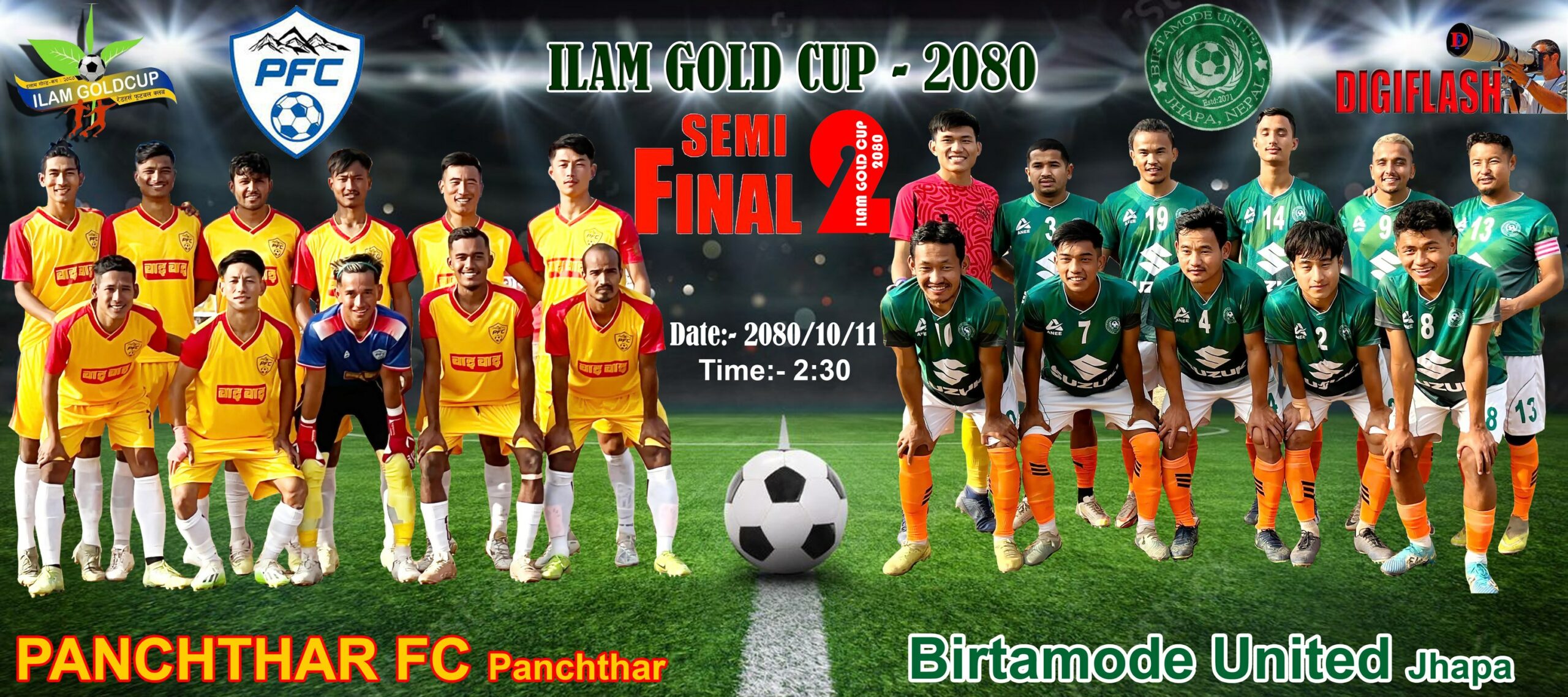 विराटनगर । इलाम सदरमुकाममा जारी इलाम गोल्डकप फुटबल प्रतियोगिताको अन्तिम सेमिफाइनल खेल आज बिहीबार हुँदैछ ।फाइनलमा पुग्ने लक्ष्यका साथ आज पाँचथर फुटबल क्लब र झापाको बिर्तामोड फुटबल क्लबले प्रतिस्पर्धा गर्दैछन् ।