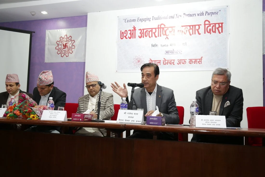 सम्मान कार्यक्रममा चेम्बरका अध्यक्ष मल्लले आयत निरुत्साहित र निर्यात प्रर्वद्धन हुने गरी व्यापार सहजीकरण हुनुपर्ने बताए । उनले भन्सारमा सन्दर्भ मुल्य भन्दा पनि कारोबार मुल्यलाई मान्यता दिनुपर्नेमा जोड दिए । भन्सार प्रशासन सुधार गरे मात्रै राजश्वमा सुधार आउने मल्लको भनाई छ । अध्यक्ष मल्लले भने, ‘भन्सार प्रक्रीयालाई सहजीकरण एवं सवै भन्सारहरुमा उच्चस्तरीय क्वारेन्टीन ल्यावको व्यवस्थापन गरिनुपर्दछ, ।’