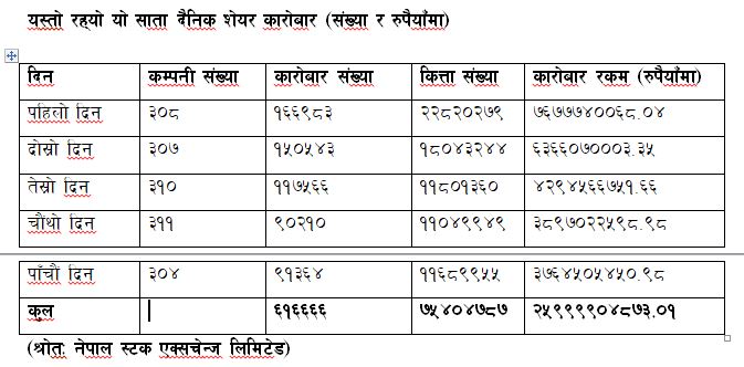 लगानीकर्ताहरुको यही बुझाईकाबिच यो साता नेप्से दुई हजार ८४ दशमलव शुन्य नौं अंकमा खुम्चिन पुगेको छ । यसैगरी क बर्गका कम्पनीहरुको कारोबार मापन गर्नै सेन्सिटिभ इन्डेक्स पनि तीन सय ७९ दशमलव ४६ अंकमा खुम्चिन पुगेको छ । सातामा तीन सय ११ वटा कम्पनीहरुको छ लाख १६ हजार छ सय ६६ पटकको कारोबारमा सात करोड ५४ लाख चार हजार सात सय ८७ कित्ता शेयर किनबेच भएका छन् । जसबाट यो साता कुल कारोबार रकम २५ अर्ब ९९ करोड ९९ लाख चार हजार आठ सय ७३ रुपैंयाँ कायम भएको छ । यो कारोबार रकम गत साताको तुलनामा पाँच अर्ब रुपैंयाँले कम हो । गत साता ३१ अर्ब ४१ करोड ८२ लाख ४० हजार तीन सय ६४ रुपैंयाँको सेयर कारोबार भएको थियो । कुल तीन सय १४ वटा कम्पनीहरुको सात लाख ४२ हजार ८१ पटकको कारोबारमा नौं करोड ४६ लाख २६ हजार सात सय ६५ कित्ता शेयर खरिद–बिक्री उक्त परिमाणमा रकम कारोबार भएको थियो ।